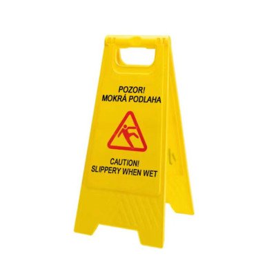 Plastový stojan žluté barvy se symbolem viditelným z obou stran a upozorňujícím na mokrou podlahu s nebezpečím uklouznutí a možného zranění. Stojan jasně žluté barvy přispívá díky dobré viditelnosti ke snížení rizika úrazu. Stabilní provedení, snadno přenosné, v horní části praktická rukojeť, nízká hmotnost, velmi odolný plast na bázi PVC, potisk odolný proti UV záření