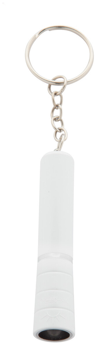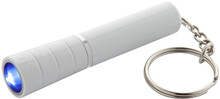 Plastová mini baterka s 1 LED a kovovým kroužkem na klíče. S knoflíkovou baterií.