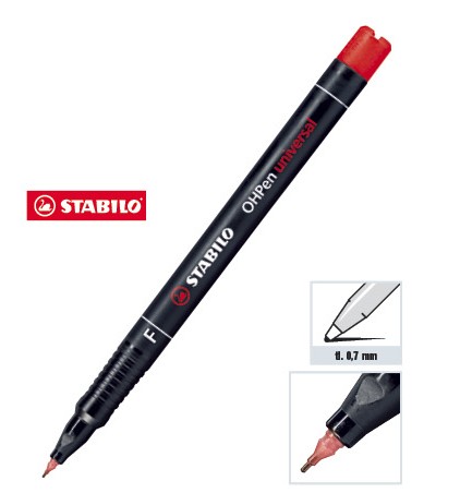 Prezentace v práci či ve škole budou se STABILO OHPen mnohem snazší. Tato řada popisovačů s neklouzavou úchopovou zónou se skvěle hodí například na psaní na průhledné prezentační folie nebo jiné hladké povrchy jako jsou (plast, sklo, kov, keramika…). Inkoust je na lihové bázi, bez zápachu. Šíře stopy 0,7 mm. Vydrží až 3 dny bez víčka. Doporučujeme však pokaždé uzavřít.