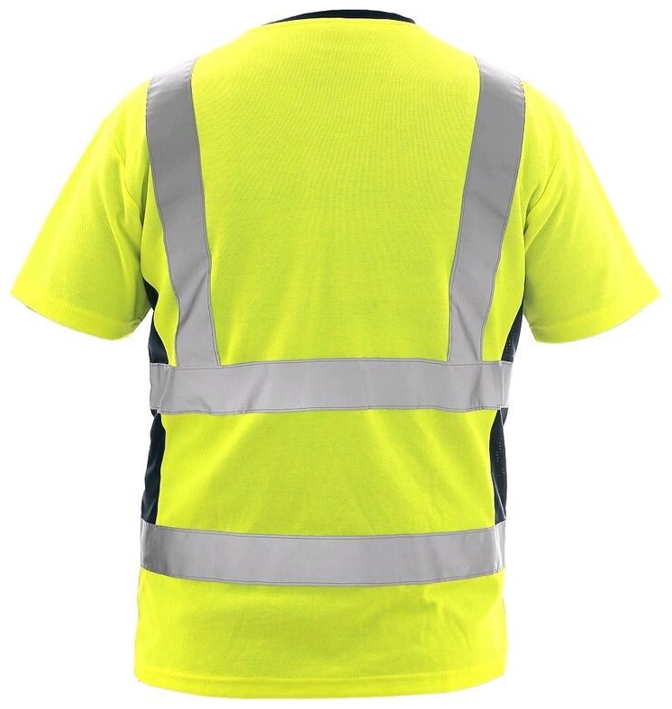 Výstražné tričko s kulatým průkrčníkem v kontrastní modré barvě, krátký rukáv, reflexní pruhy: 2 horizontální, 2 vertikální (šíře 5 cm), po stranách panely ze síťoviny v modré barvě. Doporučené použití: stavebnictví, silničáři, řidiči, logistika, údr