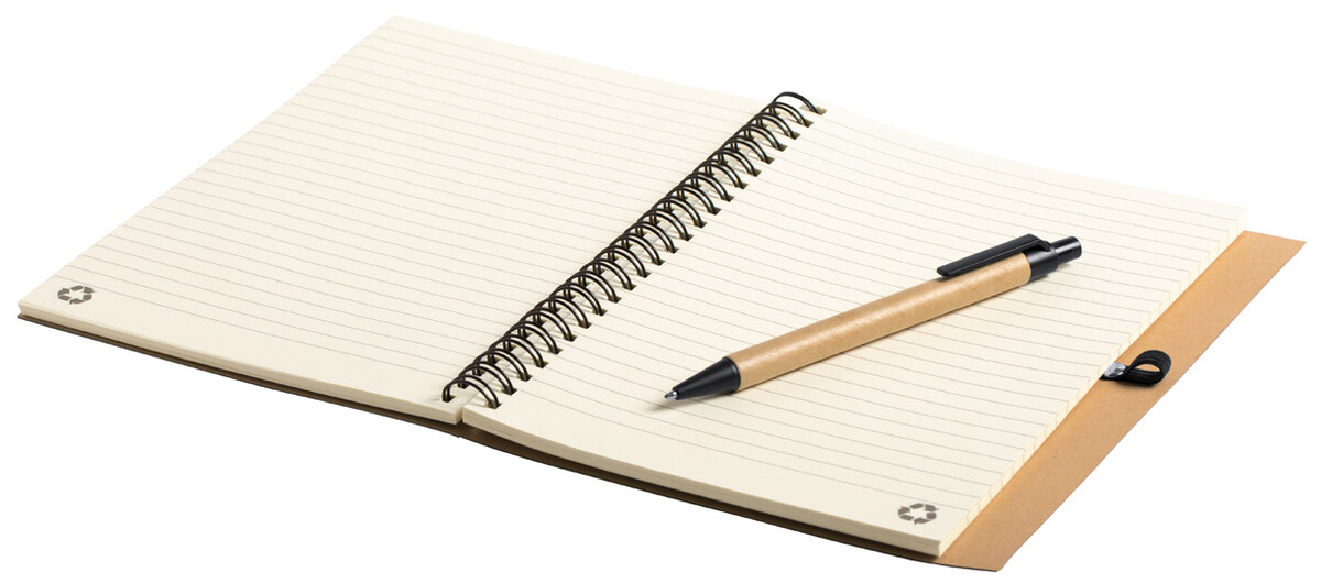 Blok A5 s deskami z recyklované lepenky se spirálou a 80 linkovanými listy. Vč. kuličkového pera z recyklovaného papíru a s modrou náplní.