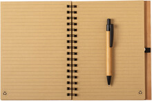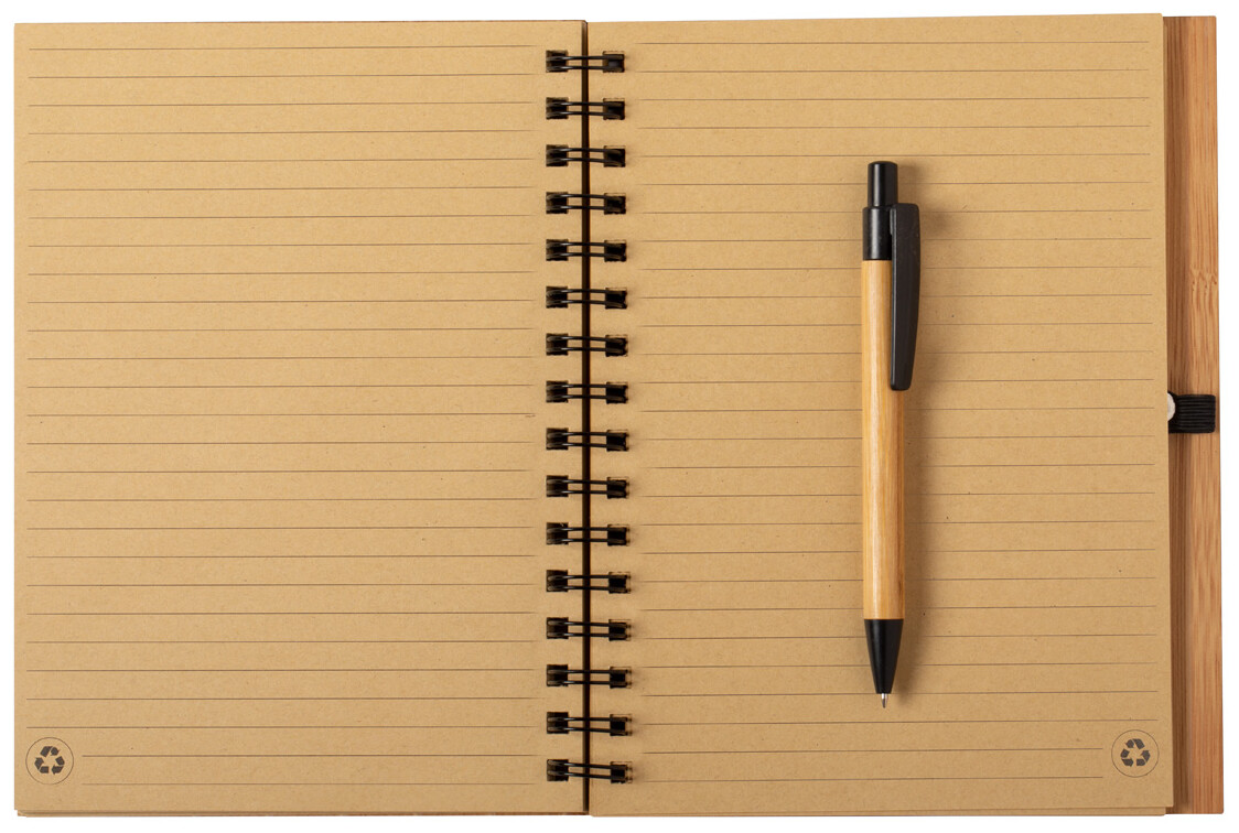 Blok A5 se spirálou v bambusových deskách s 80 linkovanými listy. Vč. kuličkového pera z bambusu s černou náplní.