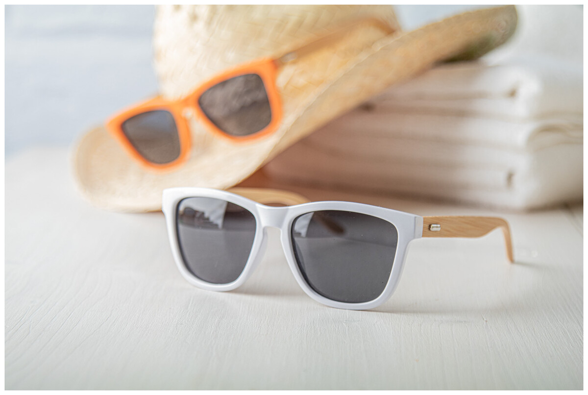 Sluneční brýle s barevnými plastovými obroučkami a bambusovými nožičkami. S ochranou UV 400.