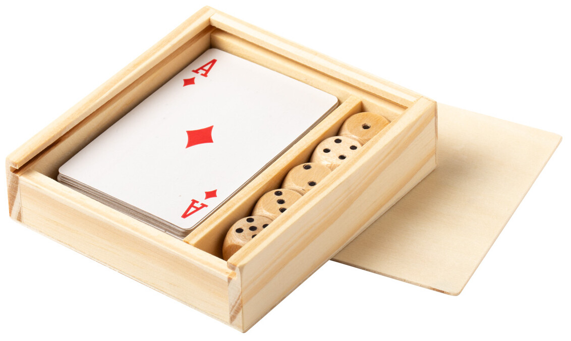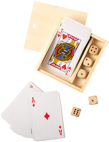 Sada her v dřevěné krabičce - francouzské hrací karty a 5 kostek.
