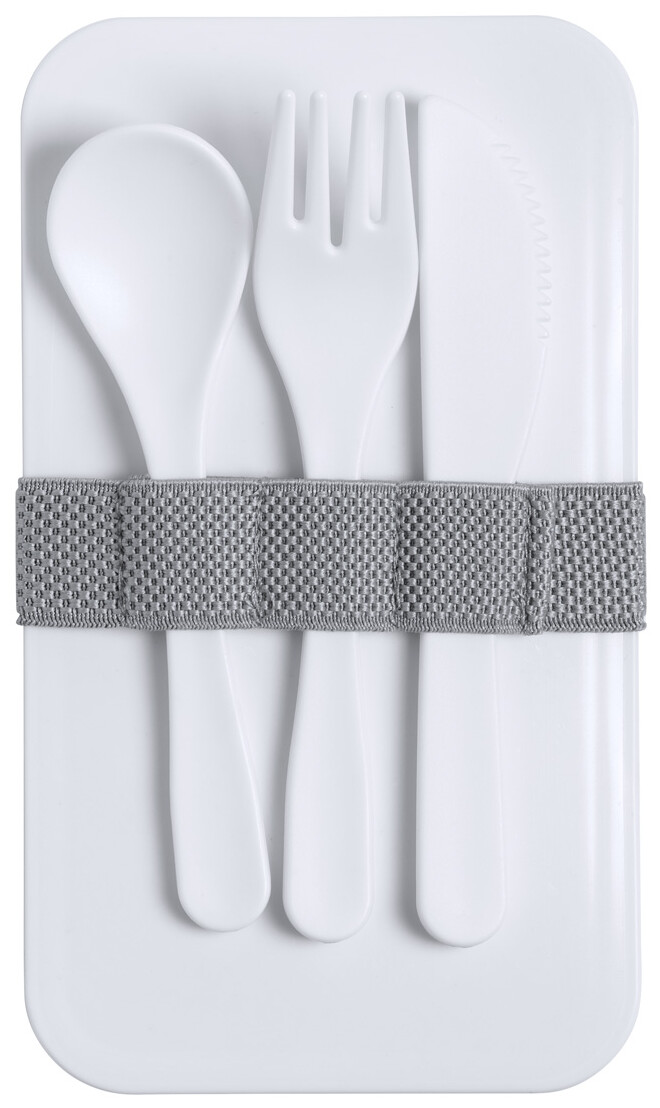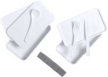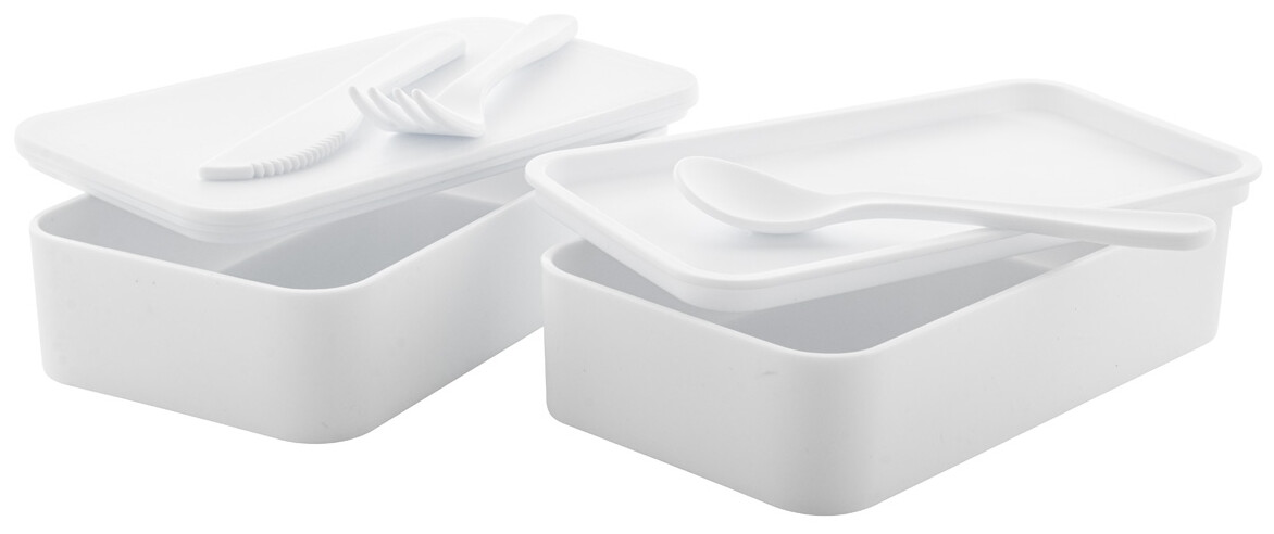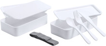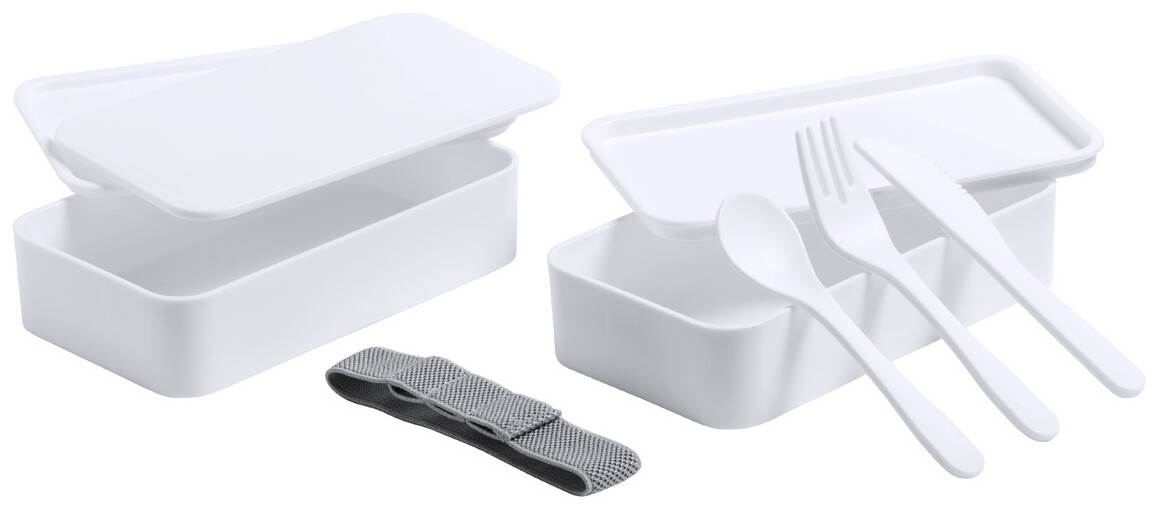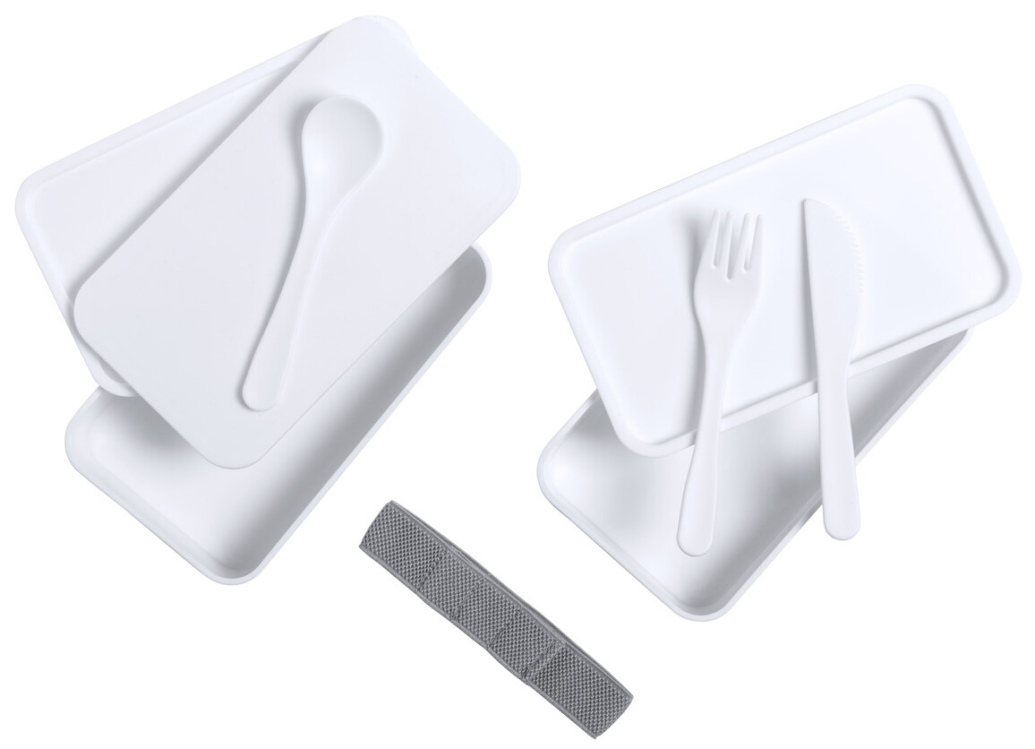 Box na jídlo z antibakteriálního plastu se sadou příborů (vidlička, lžíce a nůž) a elastickým popruhem. Každý má 2 oddíly o objemu 700 ml. V souladu s ISO 22196.