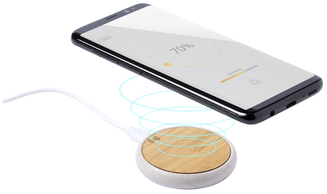 Bezdrátová nabíječka (10W) v plastovém pouzdře z bambusu a ekologické pšeničné slámy. Včetně kabelu USB.