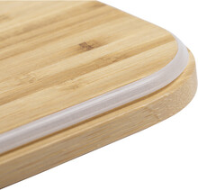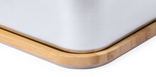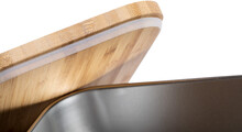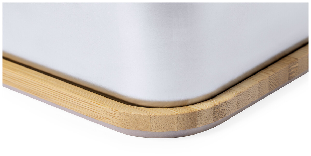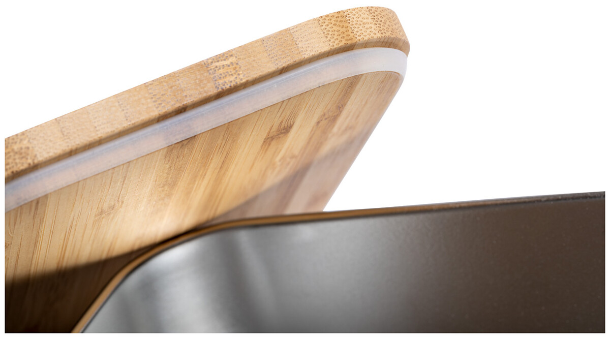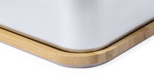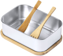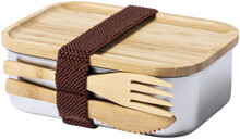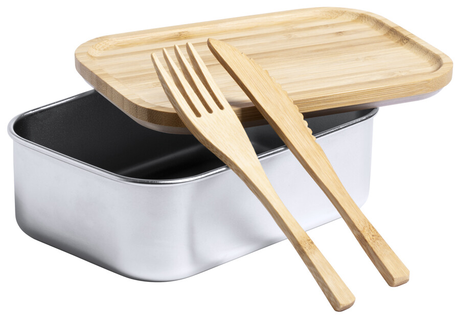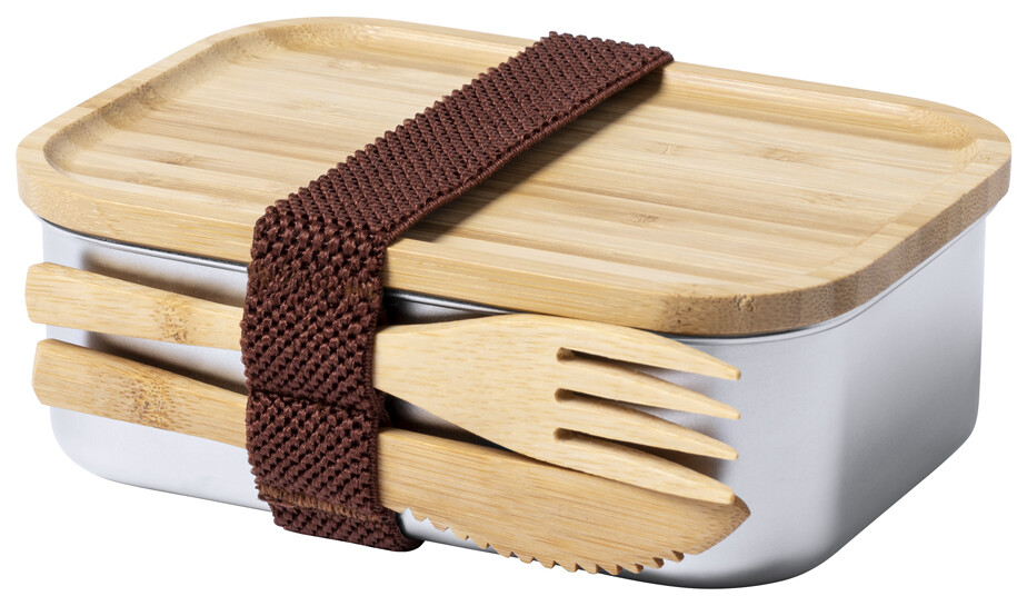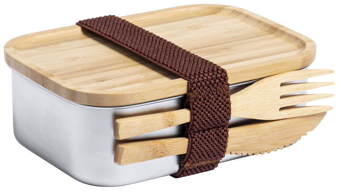 Box na jídlo z nerezové oceli s přírodním bambusovým víkem. Se sadou bambusových příborů (nůž a vidlička) a elastickým popruhem, 600 ml.
