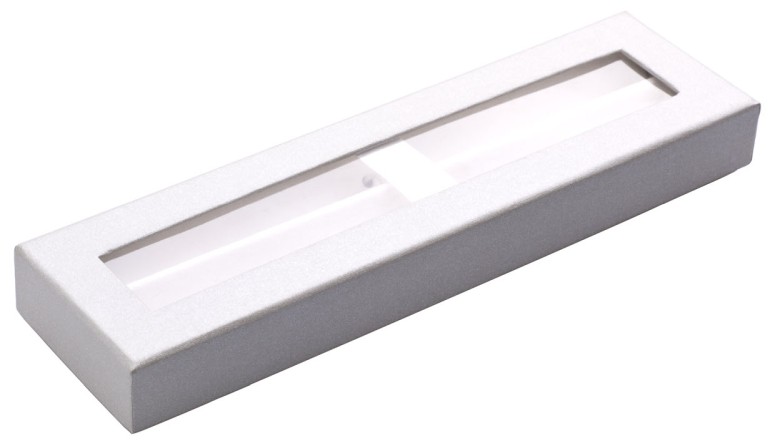 Dárková krabička na 2 tužky, stříbrný potahovaný papír a průhledné okénko v horní části