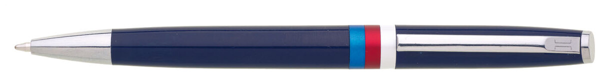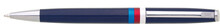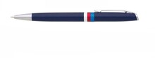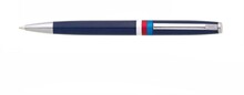Modrá otočná propiska s trikolórou a tiskem lva. Náplň velkoobsahová, modře píšící.