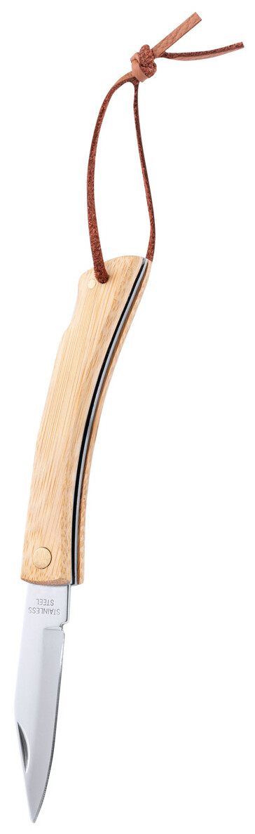 Kapesní nůž z nerezové oceli s bambusovou rukojetí a páskem z PU kůže. S bezpečnostní pojistkou.