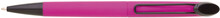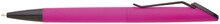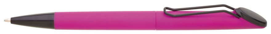 Plastová otočná propiska ARESTA v neonově fuchsiové barvě s černou špičkou a černým kovovým klipem. Na držák klipu je možné umístit epoxy samolepku. Náplň velkoobsahová, modře píšící.
