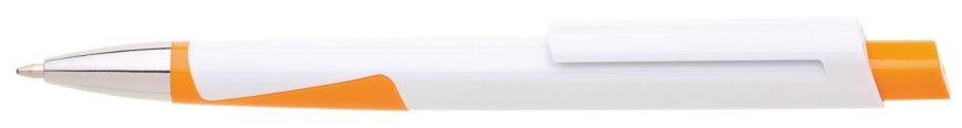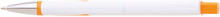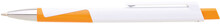 Plastová bílá propiska CARRE se čtvercovým profilem a oranžovými doplňky. Ideální na uv potisk. Náplň velkoobsahová, modře píšící.