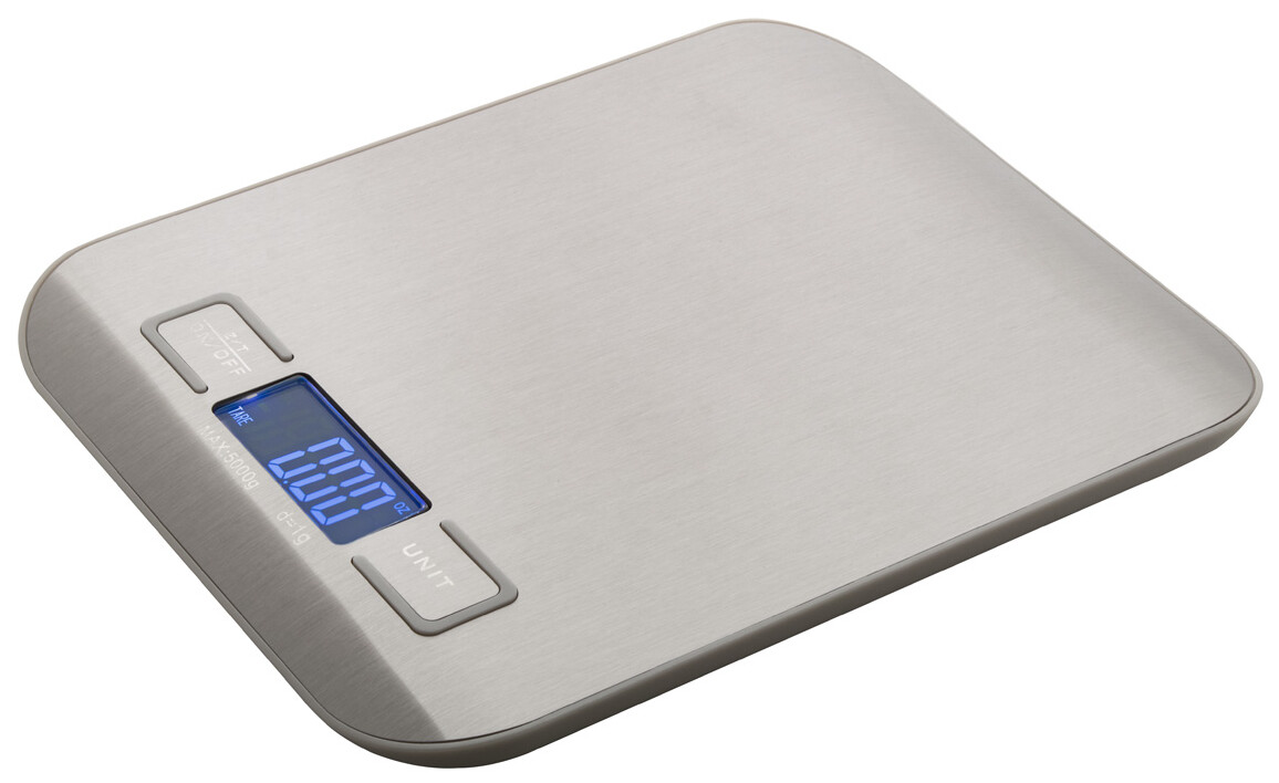 Digitální kuchyňská váha z nerezové oceli s podsvíceným displejem. Kapacita: 5 kg, stupnice 1 g, měrné jednotky: g/oz. Dodává se bez 2 baterií AAA.