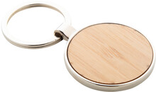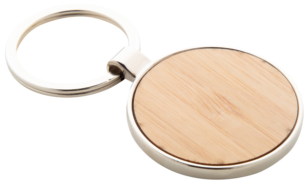 Kovový přívěsek na klíče kulatého tvaru s bambusovou vložkou. V kraftové papírové krabičce.