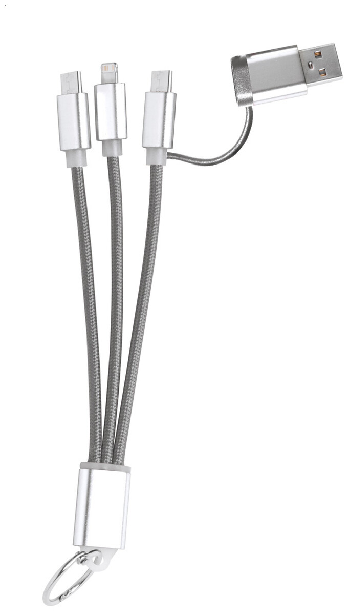 Hliníkový USB nabíjecí kabel s přívěškem na klíče. S konektory micro USB, USB-C a Lightning. Se vstupy USB a USB-C.