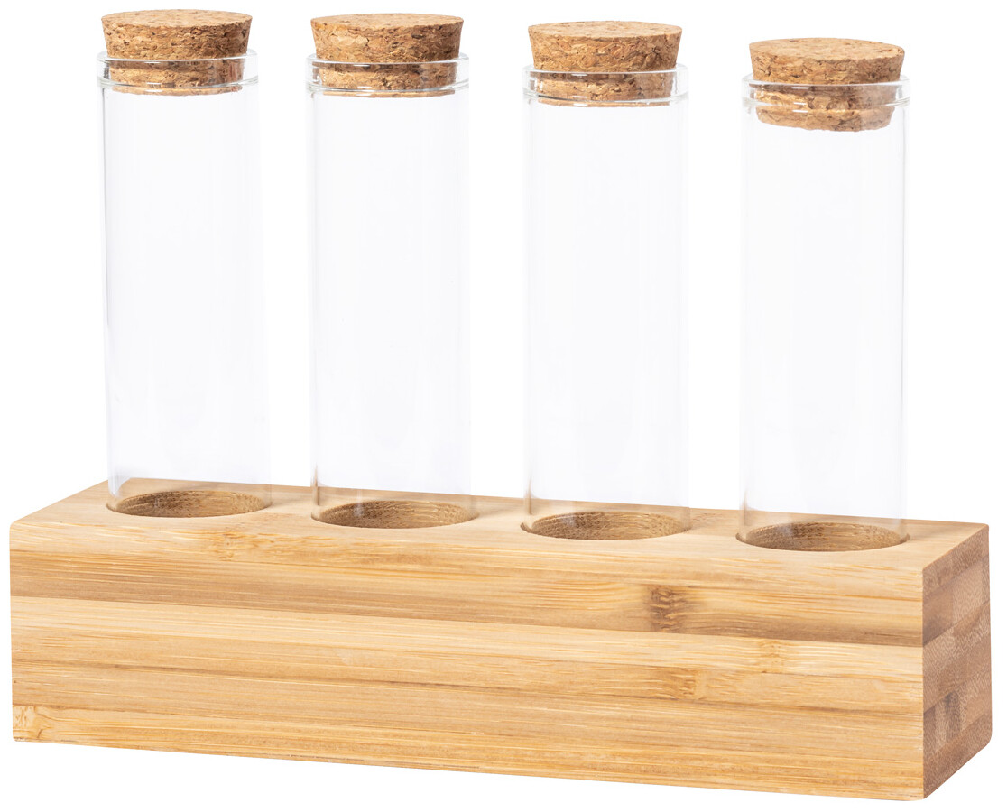 Sada 4 kusů skleněných kořenek z borosilikátového skla s víčky z přírodního korku a bambusovým stojánkem, 70 ml.