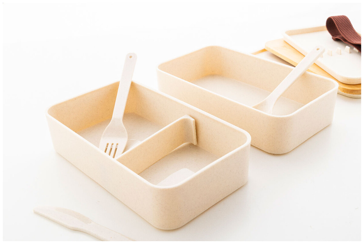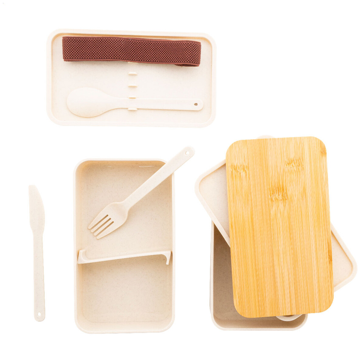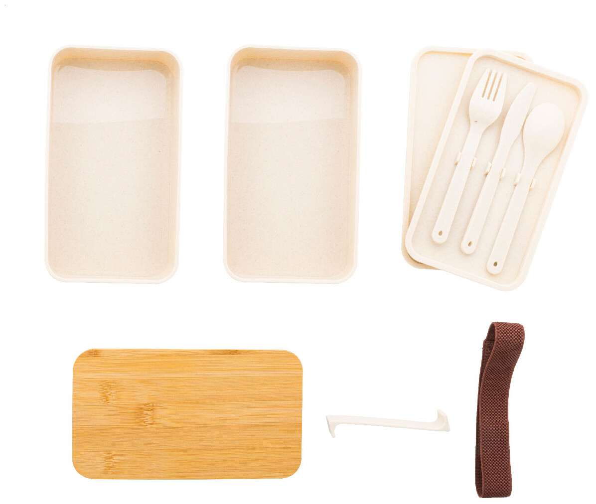 Box na jídlo z PP plastu se sadou příborů (vidlička, lžíce a nůž), bambusovým víkem a elastickým popruhem. Se 2 přihrádkami o objemu 700 ml.