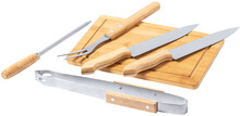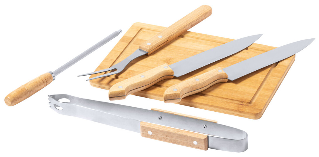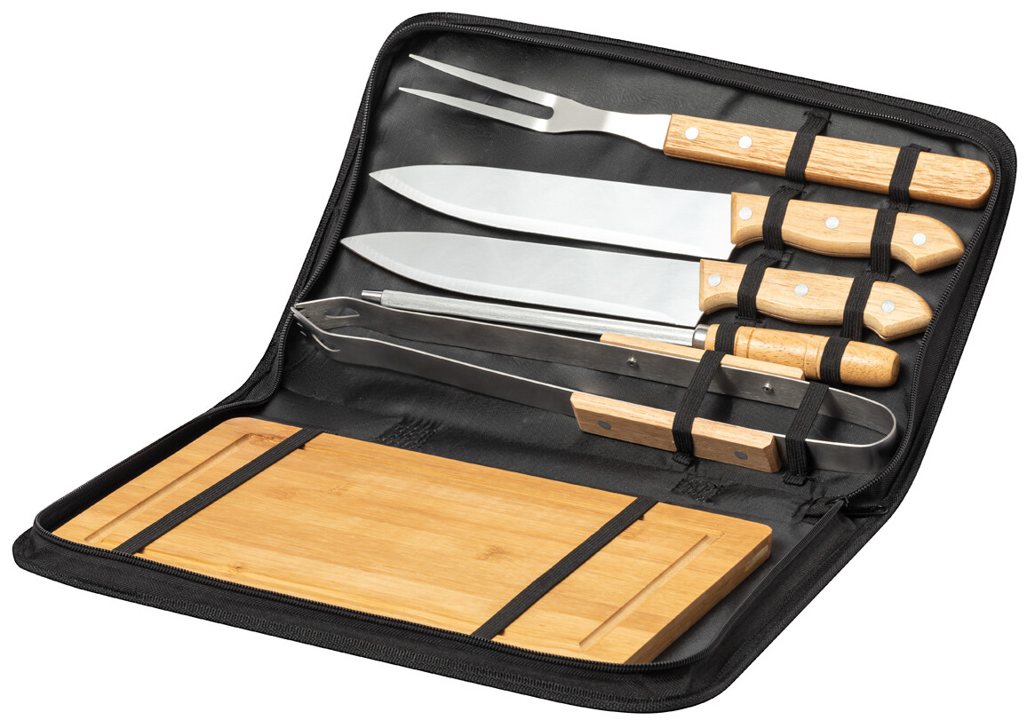6dílná sada na grilování a krájení masa ze dřeva a nerezové oceli v sáčku na zip. Včetně 2 nožů, ostřící lišty, kleští, vidličky a prkénka.