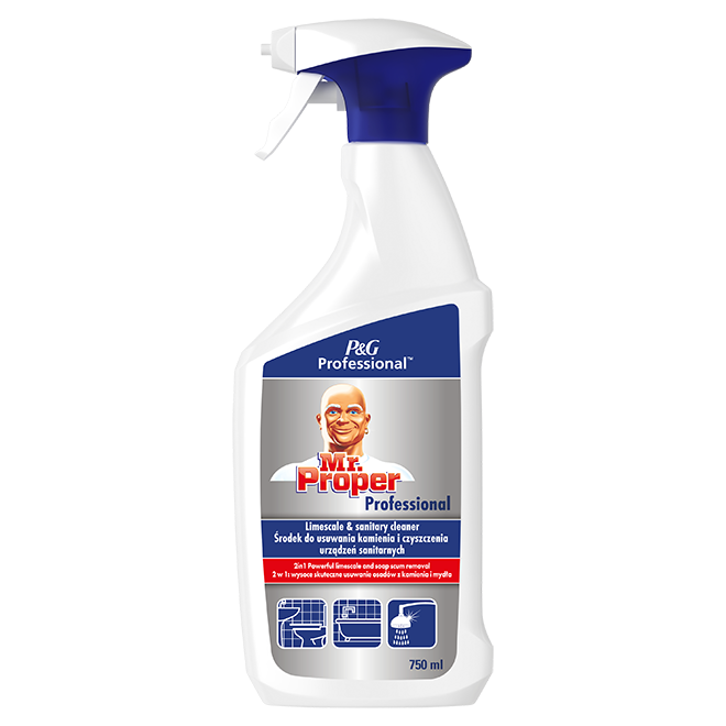 Odstraňovač vodního kamene a sanitární čistič Mr. Proper Professional je připravený k okamžitému použití ve formě spreje. Zanechává povrchy čisté a ošetřené tak, že zůstávají dlouhodobě lesklé. Účinný systém polymerů vytváří na povrchu neviditelný ochranný film, který zajišťuje dlouhotrvající lesk. Kyselá pH formule napomáhá předcházet tvorbě vodního kamene.