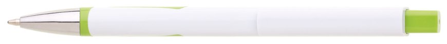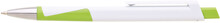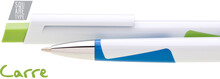 Plastová bílá propiska CARRE se čtvercovým profilem a světlezelenými doplňky. Ideální na uv potisk. Náplň velkoobsahová, modře píšící.