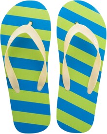 Plážové žabky na zakázku s PE podrážkou a PCV pásky. Barevnost podrážky a pásků lze na vyžádání kombinovat. Min. mn.: 50 párů/kombinace.