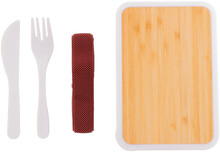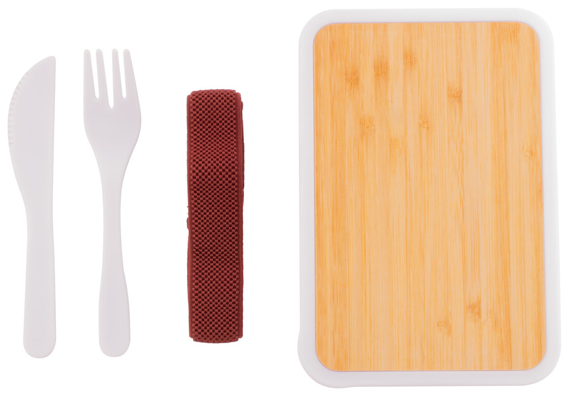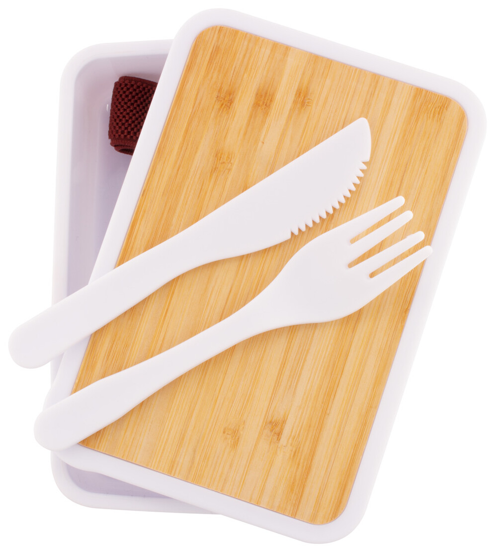 Box na jídlo z recyklovaného PP plastu s bambusovým víkem, sadou příborů (nůž a vidlička) a elastickým páskem. 500 ml.