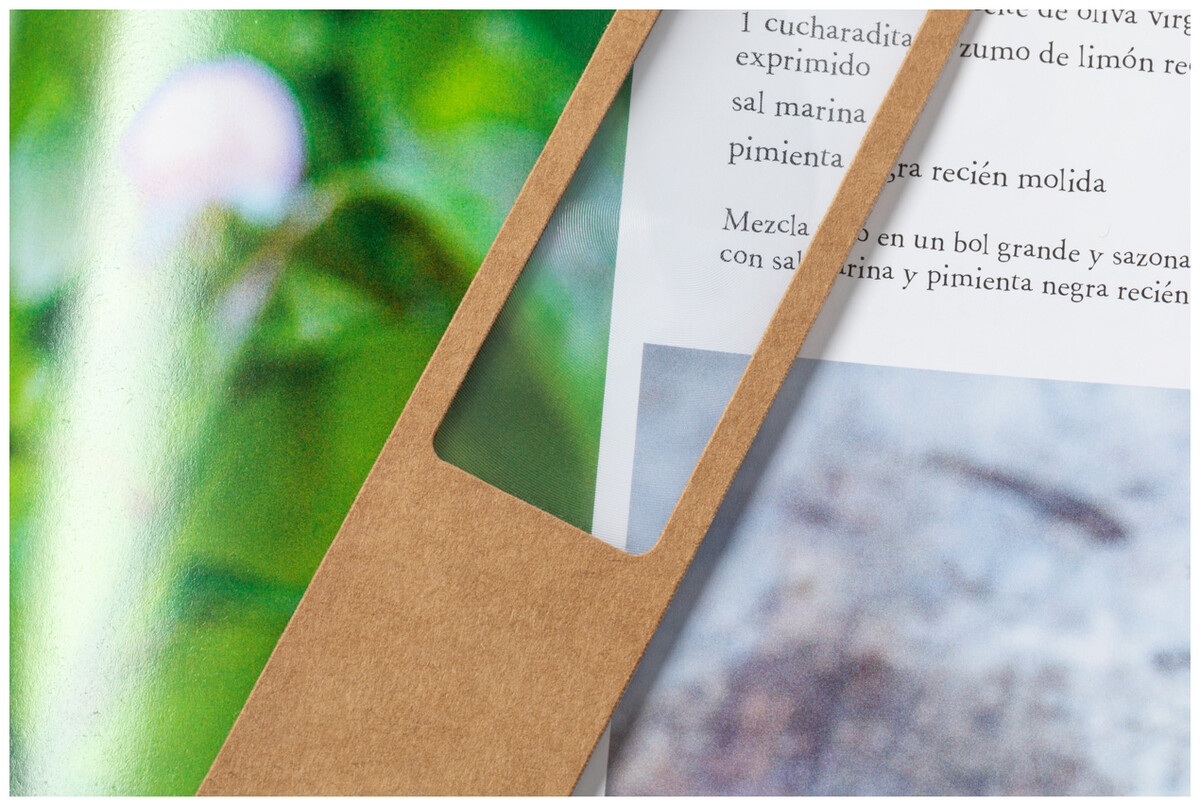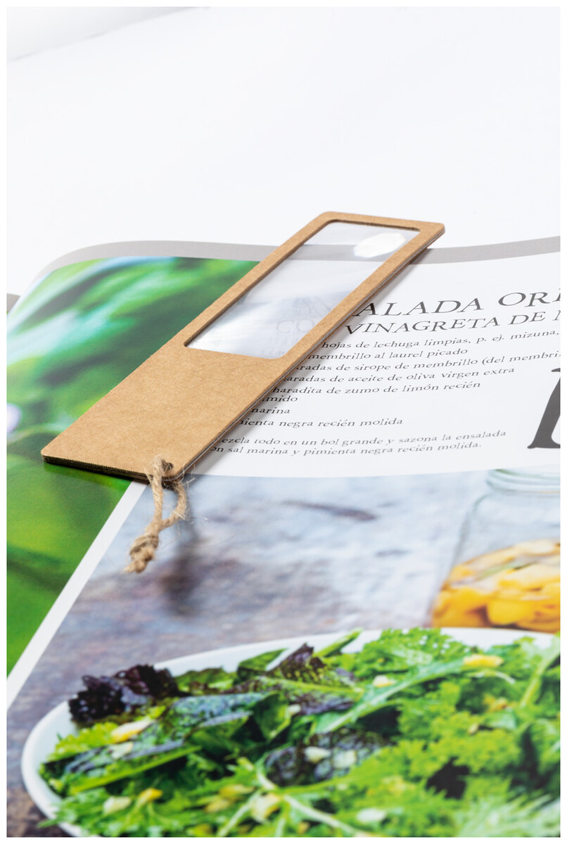 Záložka z recyklovaného papíru s lupou a provázkem.