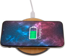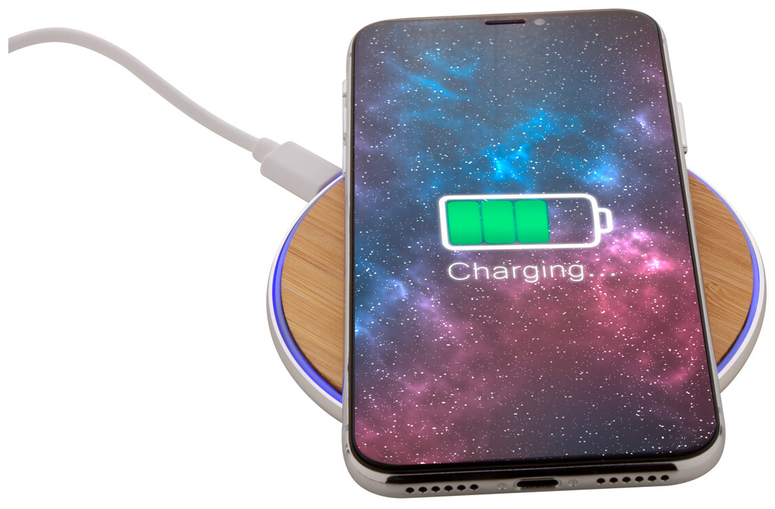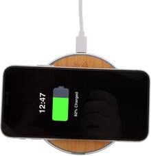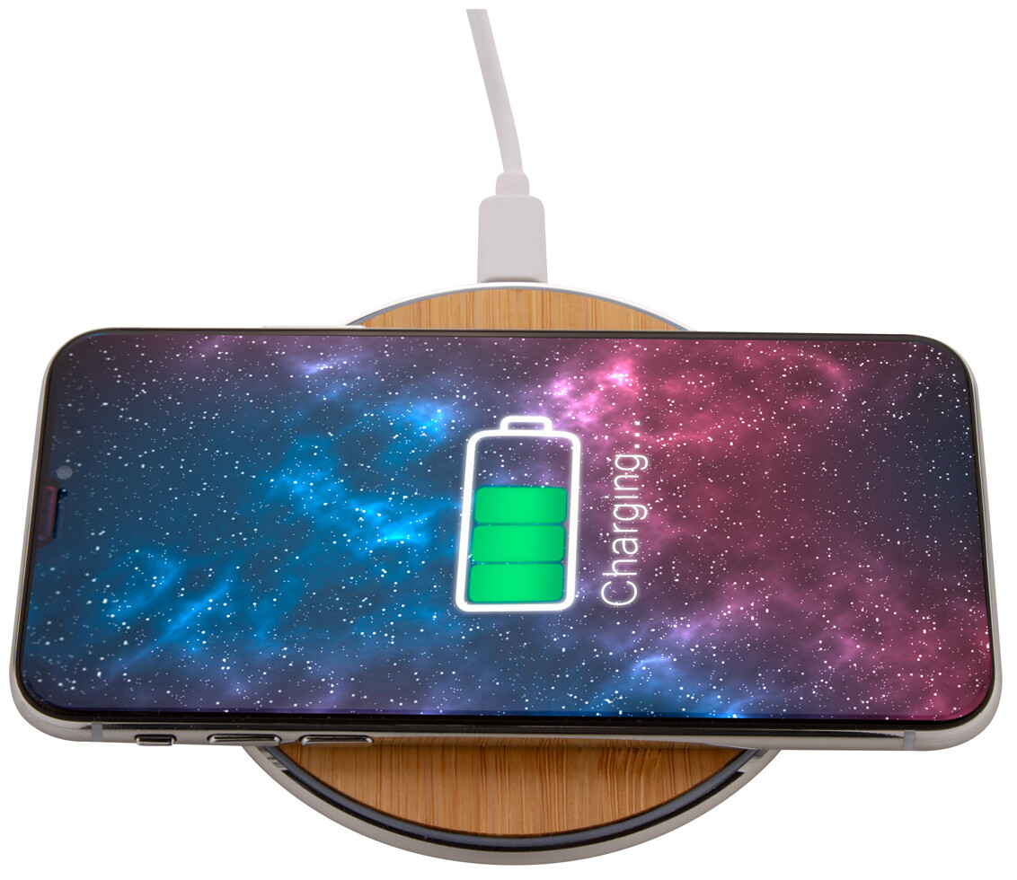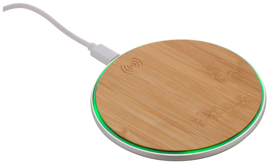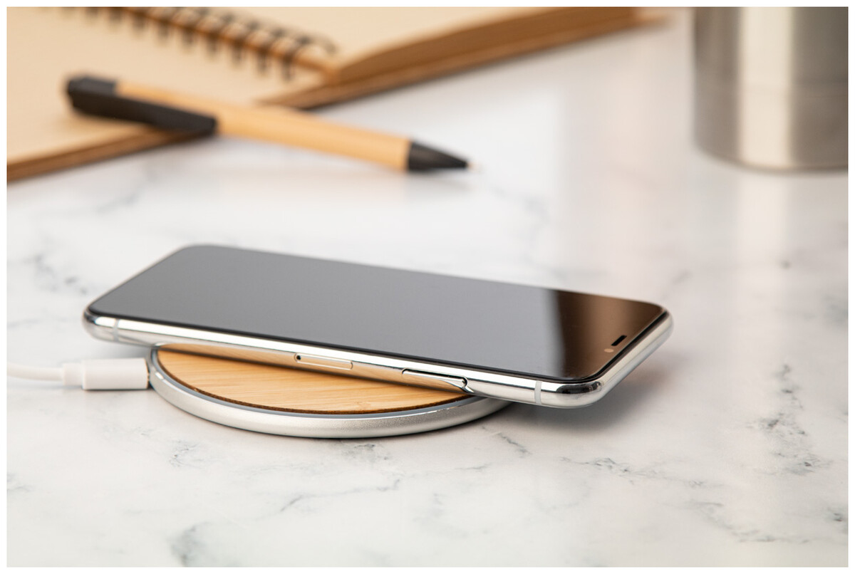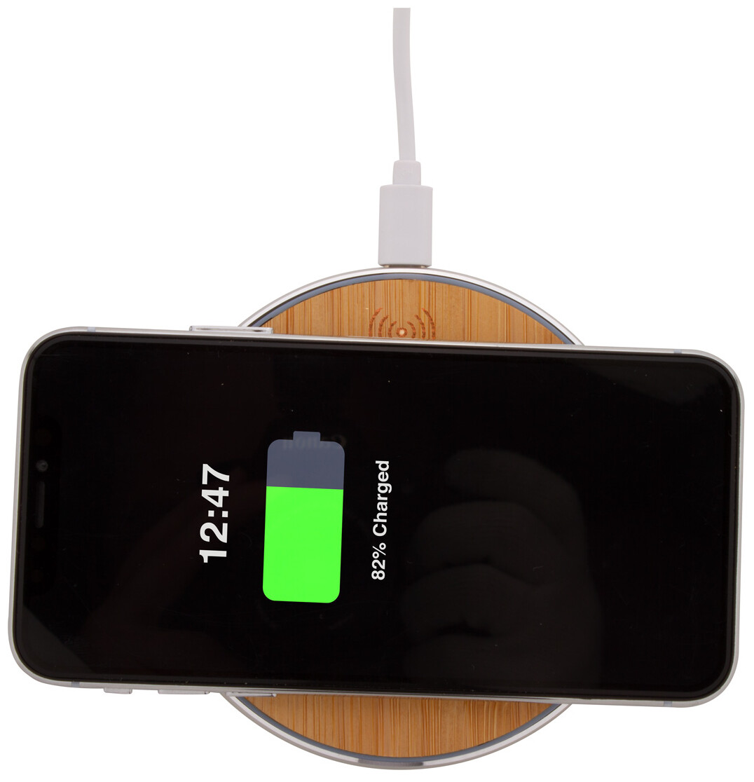 Bezdrátová rychlonabíječka (15W) v pouzdře z recyklovaného hliníku a bambusu. Včetně USB nabíjecího kabelu.