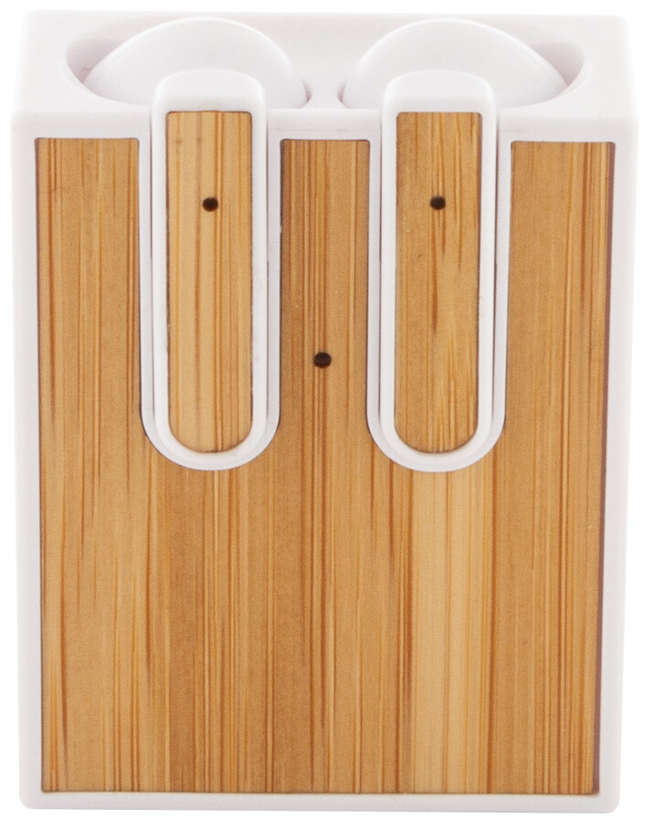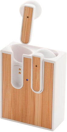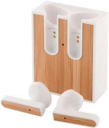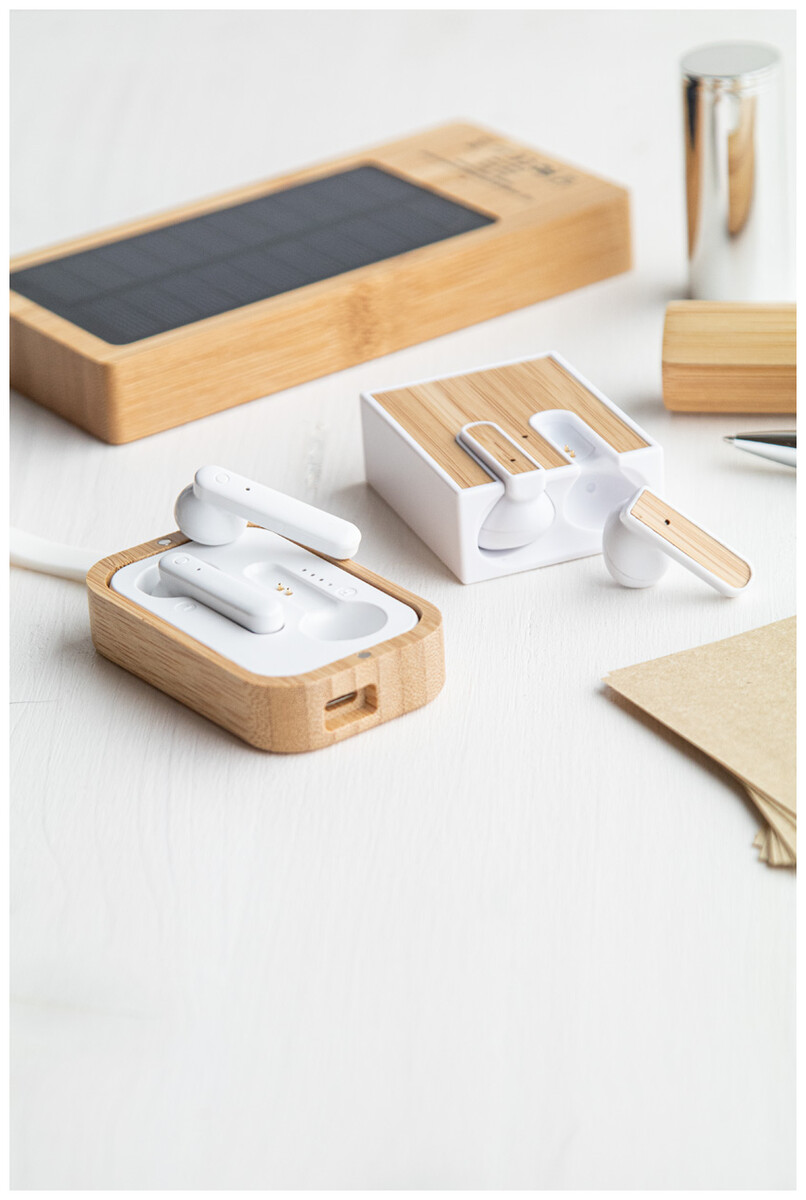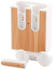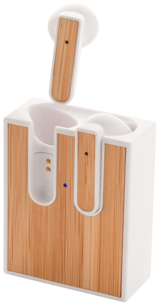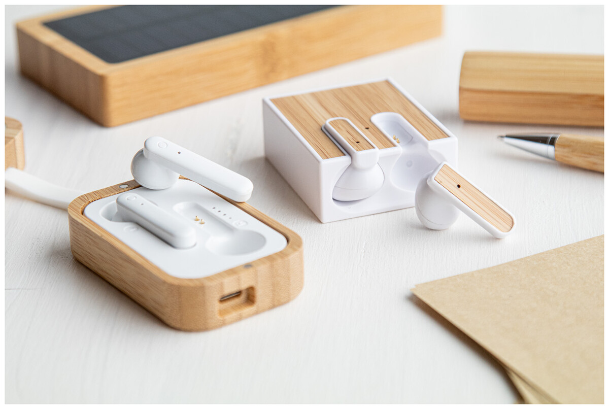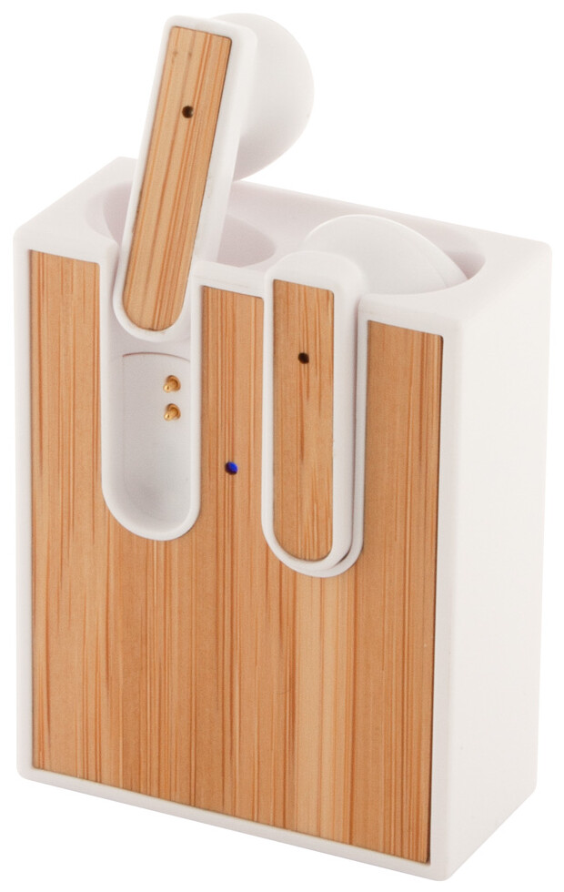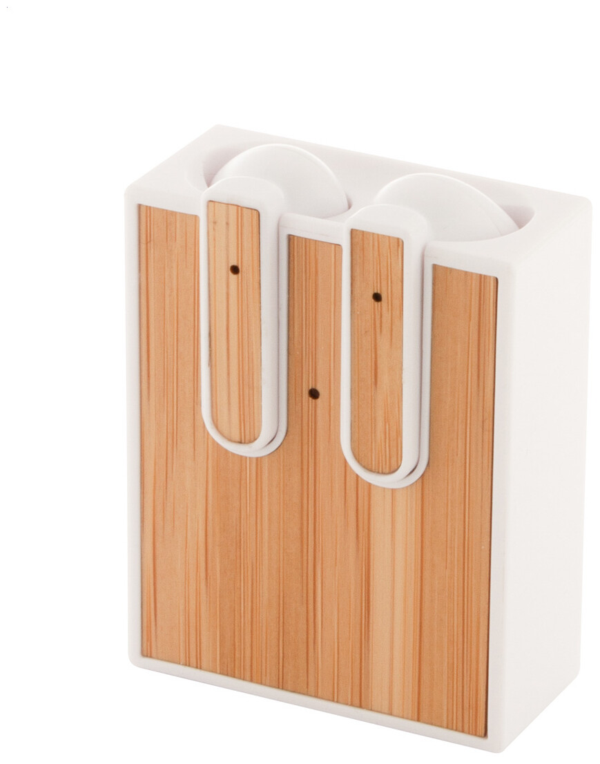 Skutečně bezdrátová stereofonní sluchátka (TWS) s bambusovou vložkou a funkcí hands-free volání. V nabíjecím pouzdře z recyklovaného ABS plastu s bambusovou vložkou. Včetně nabíjecího kabelu USB.