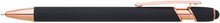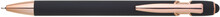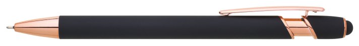 Kovová propiska se soft povrchem, touch koncovkou a doplňky v růžovo-zlaté barvě. Laserované logo je lesklé, růžovo-zlaté. Náplň semigelová, modře píšící.