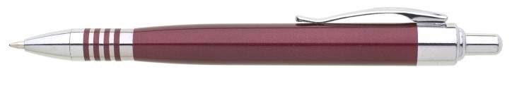 Červené zužující se metalické tělo se čtyřmi dekorativními proužky na úchopu, stříbrné doplňky. Náplň velkoobsahová, modře píšící.