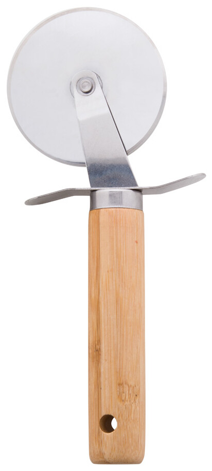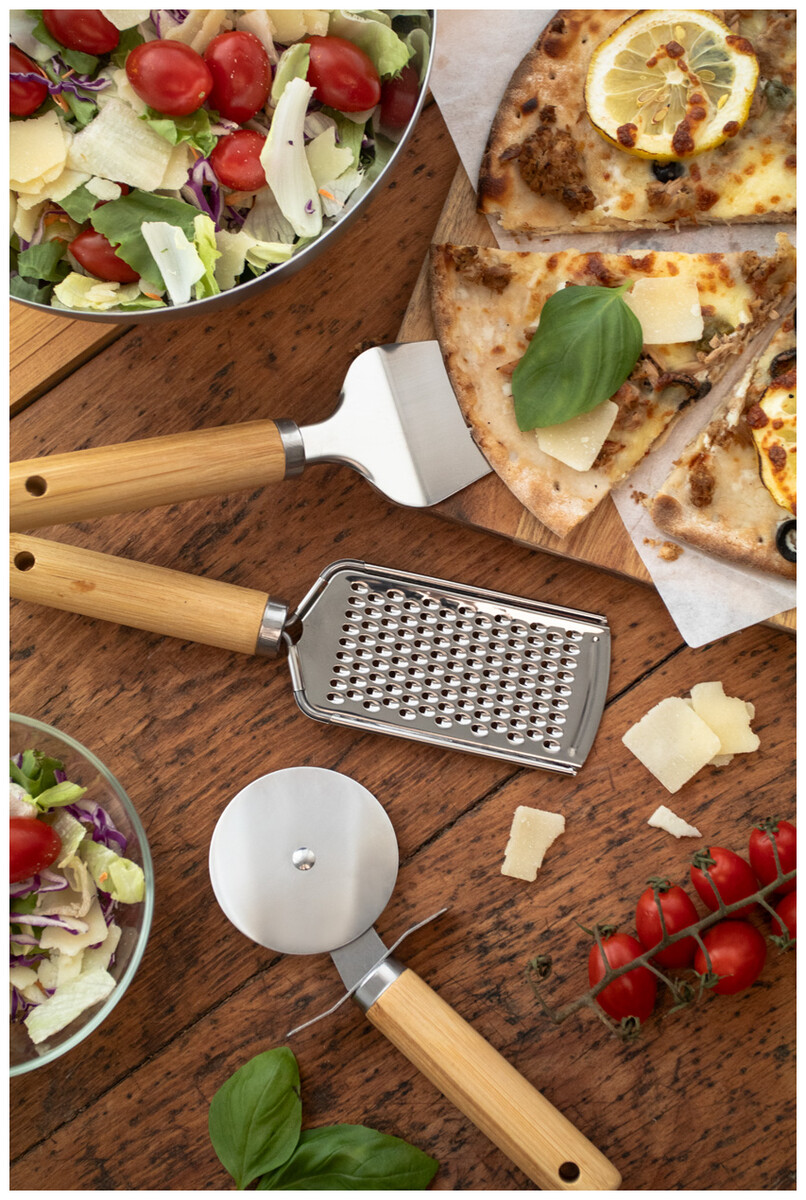 3dílná sada na servírování pizzy z nerezové oceli s bambusovou rukojetí v bavlněné taštičce se stahovací šňůrkou. Včetně struhadla na sýr, kráječe na pizzu a špachtle.