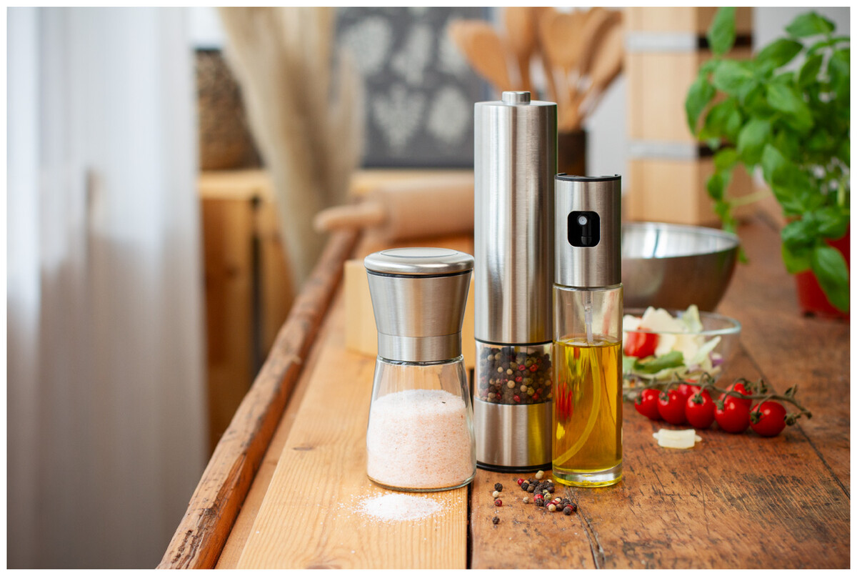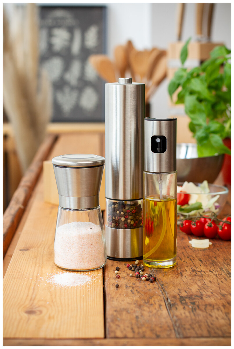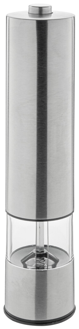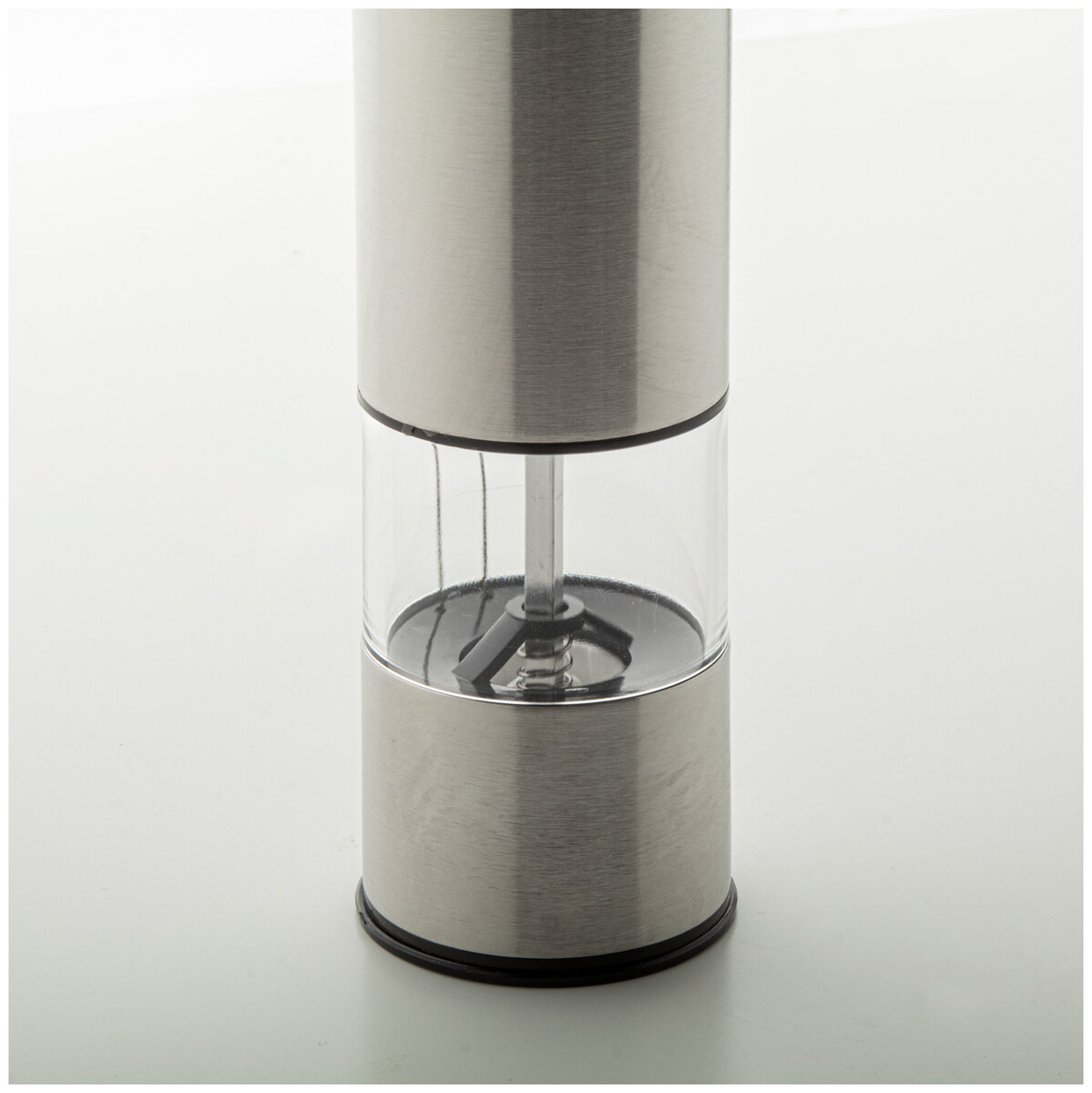 Nerezový elektrický mlýnek na sůl a pepř s keramickým jádrem mlýnku a LED osvětlením. Funguje na 4 AA baterie, bez baterií.