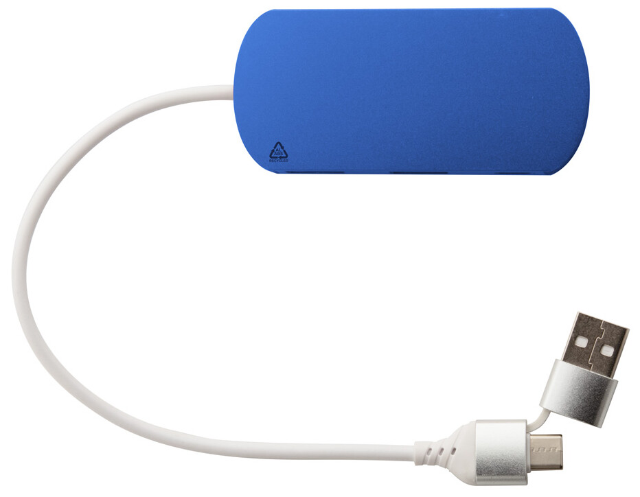 USB hub z recyklovaného hliníku a recyklovaného ABS se 2 USB a 1 USB-C portem, USB 2.0. Včetně kabelu s připojením USB a USB-C.