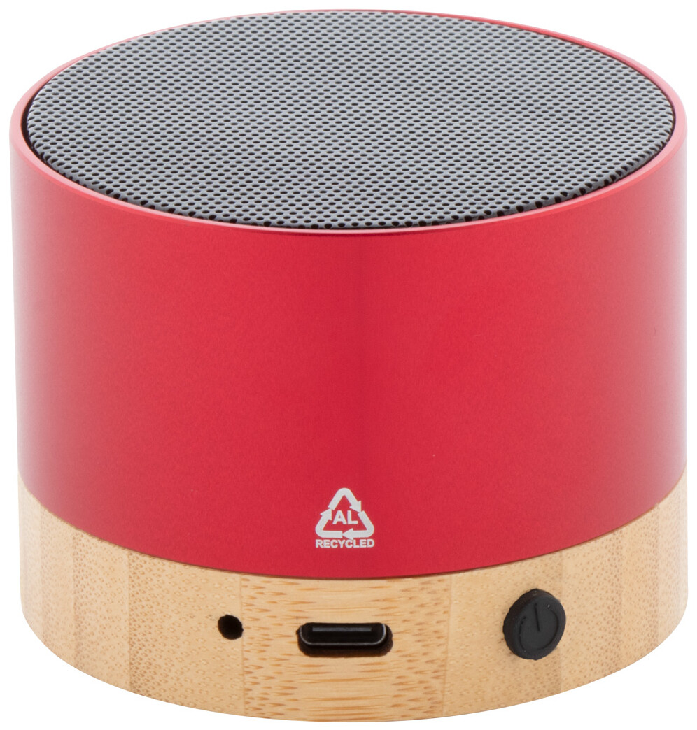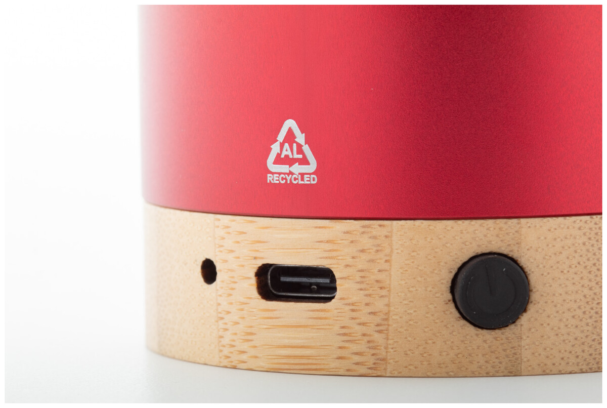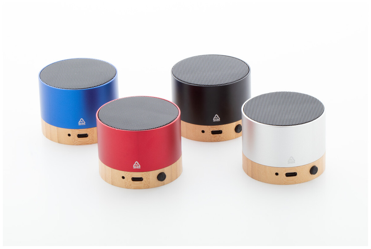 Bezdrátový reproduktor z recyklovaného hliníku s bambusovou základnou. S funkcí hands-free volání a vestavěnou dobíjecí baterií. Včetně nabíjecího kabelu USB.