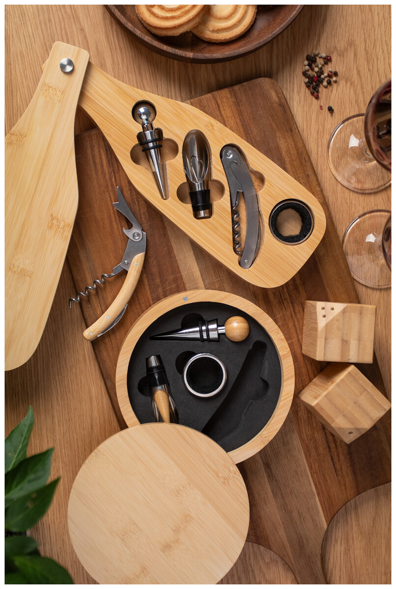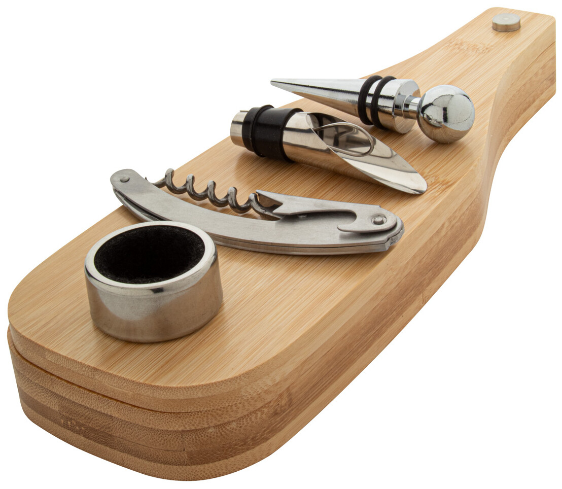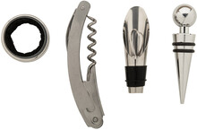 4 ks na víno z nerezové oceli v bambusové krabičce ve tvaru láhve. Včetně vývrtky, zátky, kroužku a nálevky.