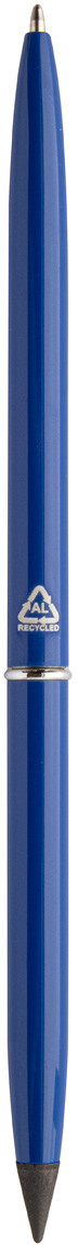 Otočné kuličkové pero 2v1 z recyklovaného hliníku a pero bez inkoustu. S modrou náplní a špičkou z kovové slitiny, která oxiduje papír. Toto pero píše podobně jako tužka a navíc je stíratelné.