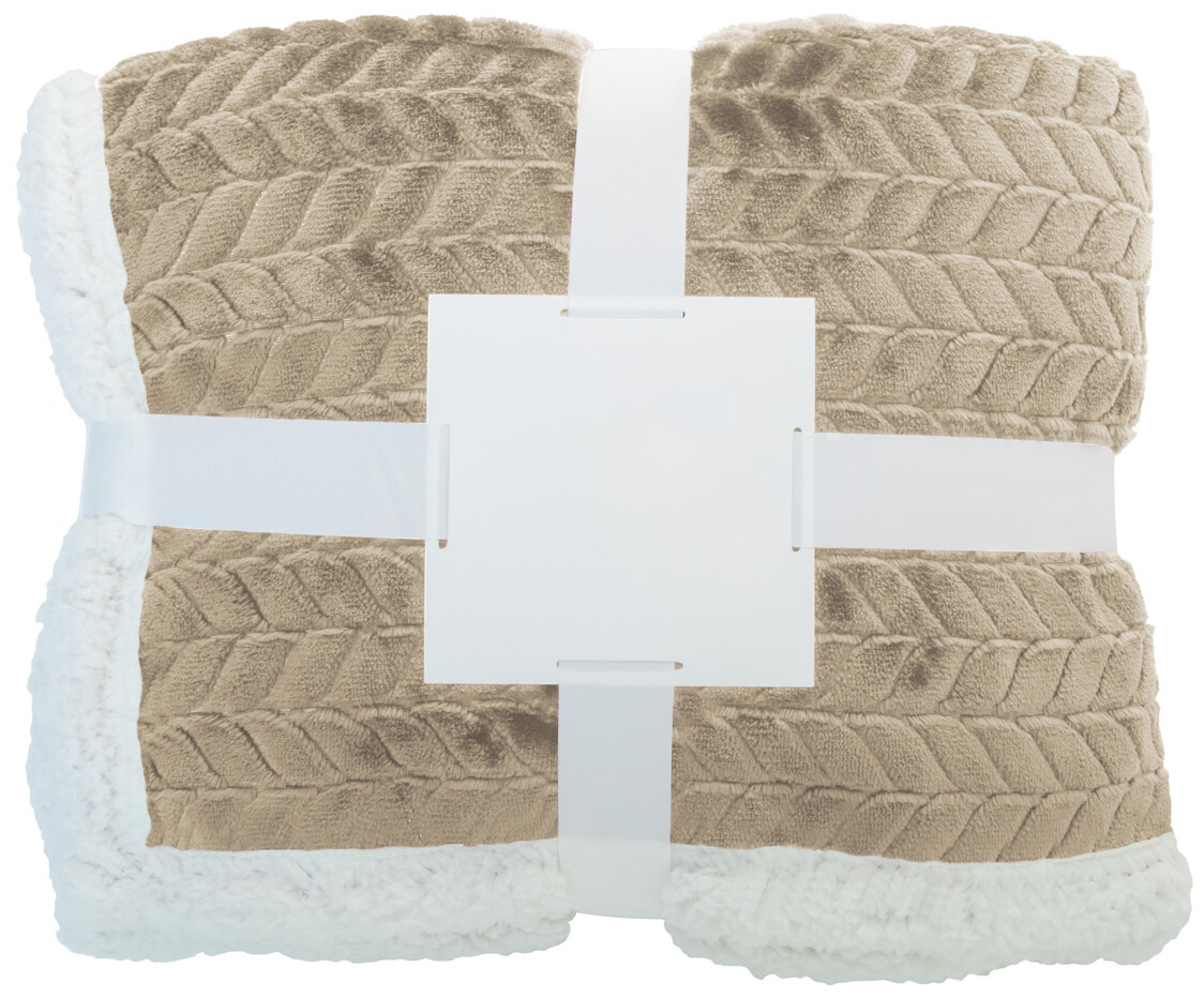 Dvouvrstvá RPET deka se žakárovým vzorem ze 240 g/m2 flanelového fleecu RPET a oboustrannou podšívkou 210 g/m2 RPET sherpa fleecu. Zabalené do stuhy a potisknutelné papírové karty.