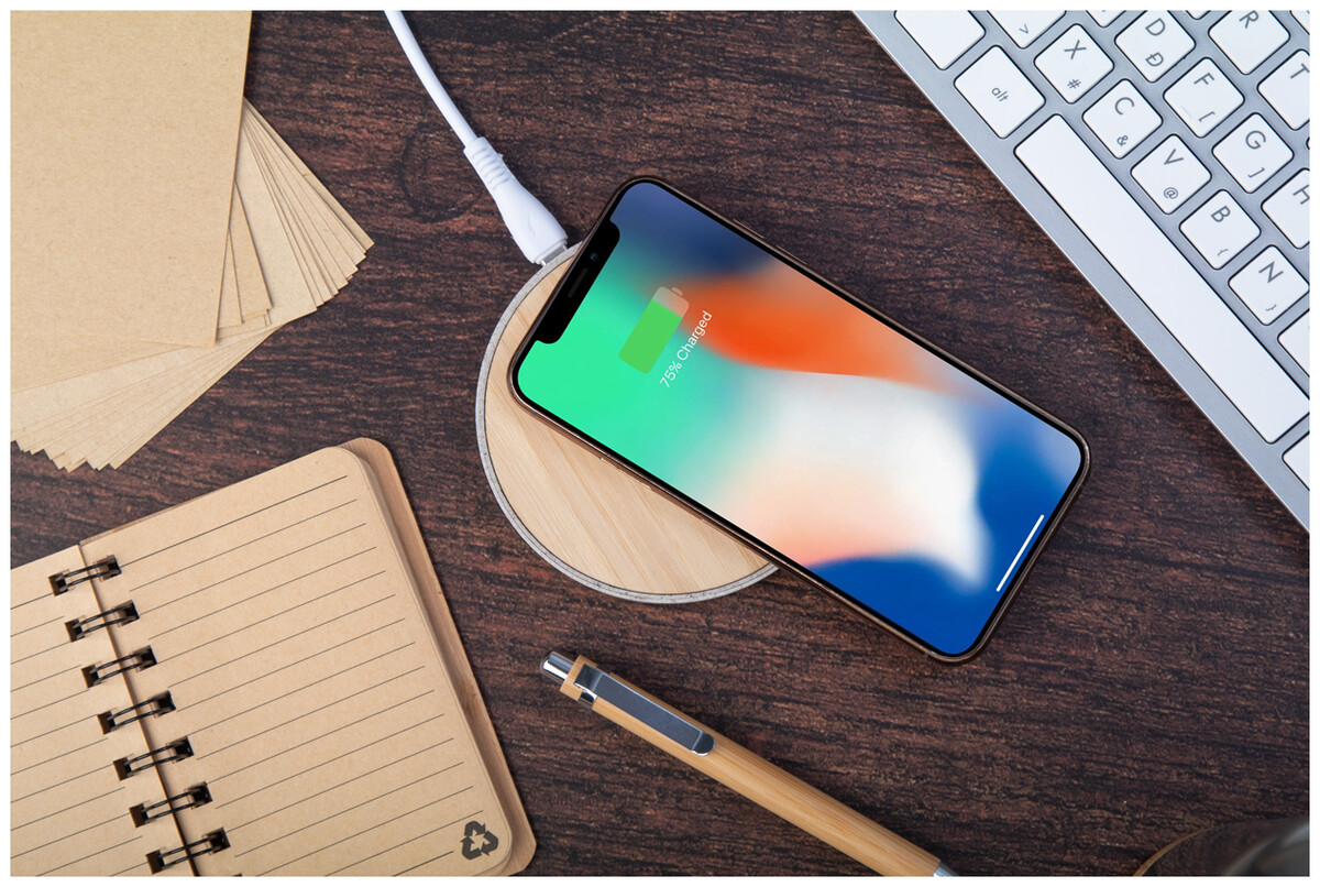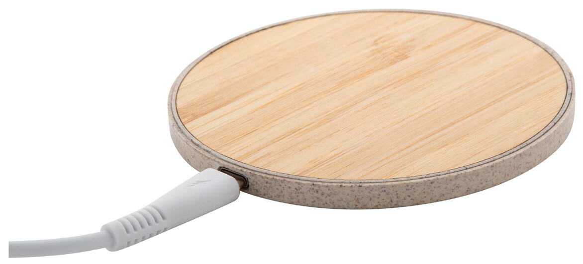 Bezdrátová rychlonabíječka (15W) v ekologickém plastovém krytu z pšeničné slámy a bambusu. Včetně USB nabíjecího kabelu.