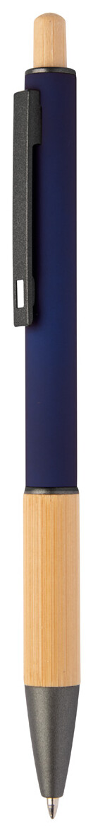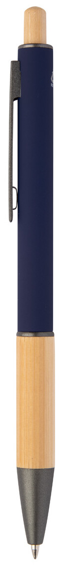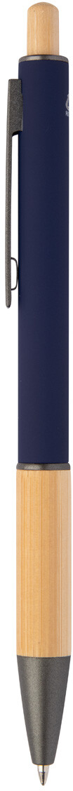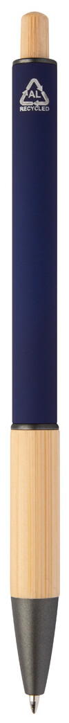 Kuličkové pero z recyklovaného hliníku s bambusovým úchopem a tlačítkem, pogumovaným tělem a kovovými částmi. S modrou náplní.