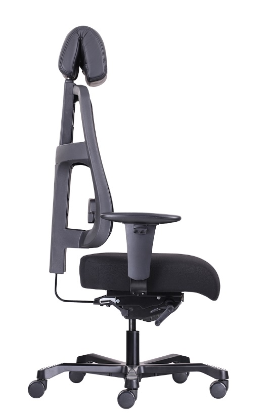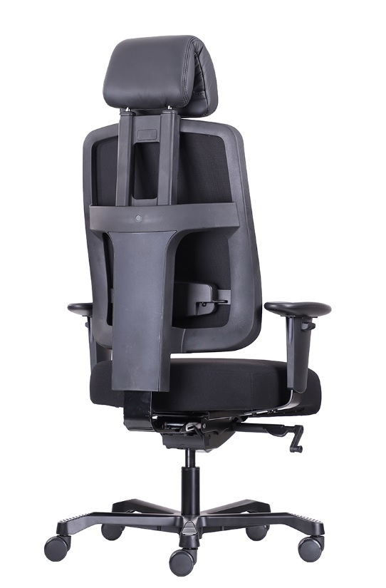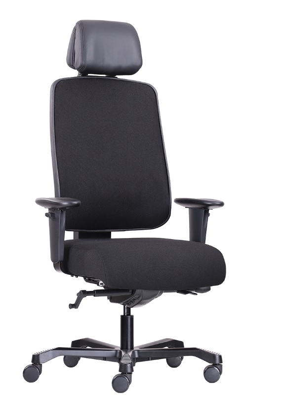 Křeslo speciálně konstruované pro vysoké a těžké postavy s aplikací 24/7 – intenzivní použití, extra vysoký síťovaný opěrák potažený látkou a opěrka hlavy čalouněná hovězí usní pro snadnou údržbu.