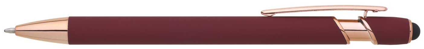 Kovová propiska se soft povrchem, touch koncovkou a doplňky v růžovo-zlaté barvě. Laserované logo je lesklé, růžovo-zlaté. Náplň modře píšící.