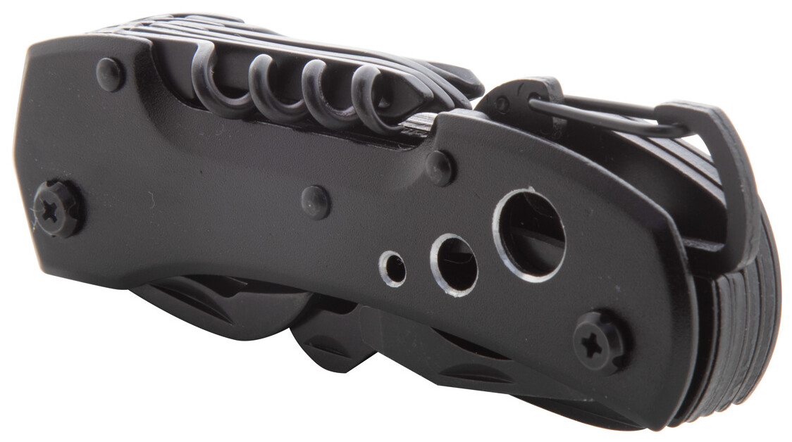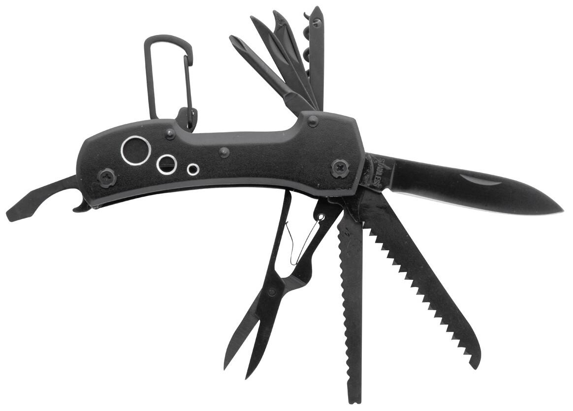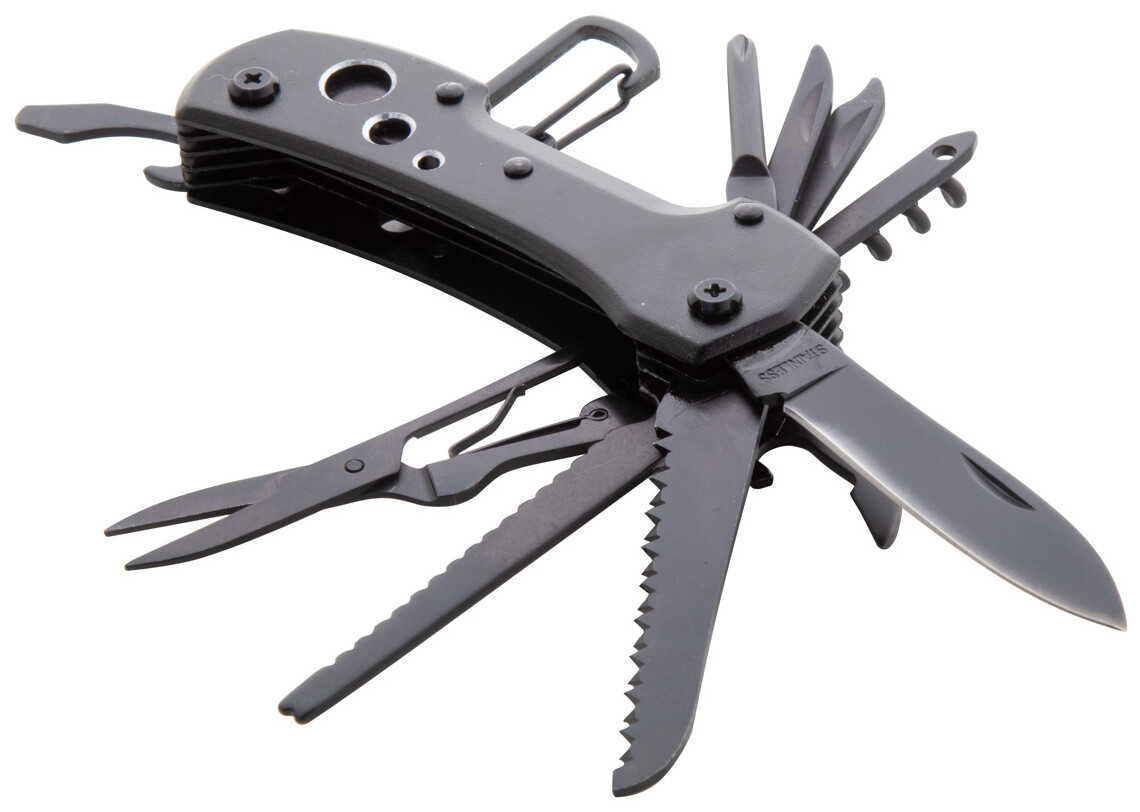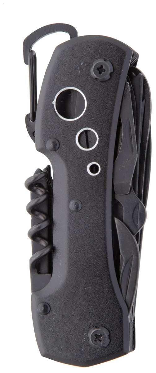 Celočerný, nerezový kapesní nůž s 13 funkcemi, karabinou a hliníkovou rukojetí.