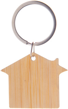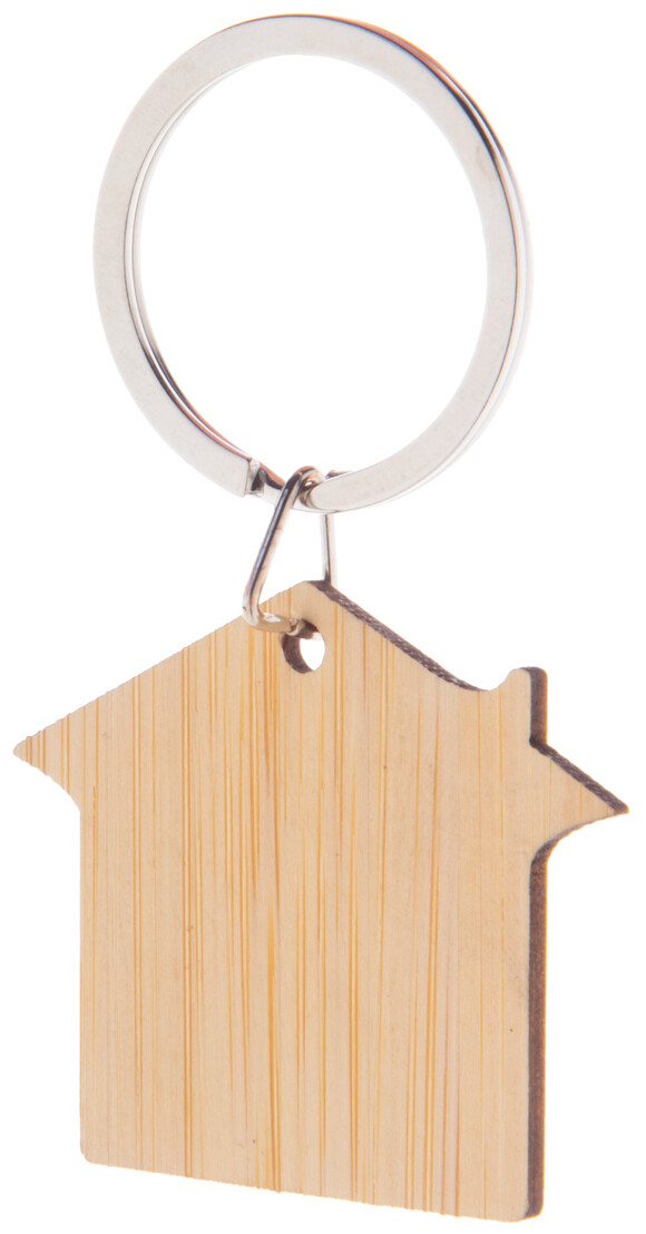 Bambusový přívěsek na klíče ve tvaru domečku s kovovým kroužkem.