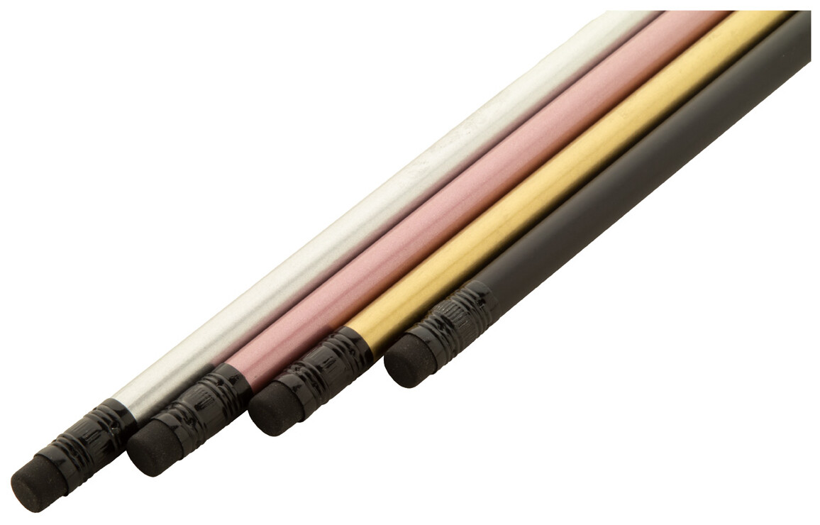 Černá dřevěná tužka v metalickém provedení, s černou gumou. Ořezaná, třída HB.