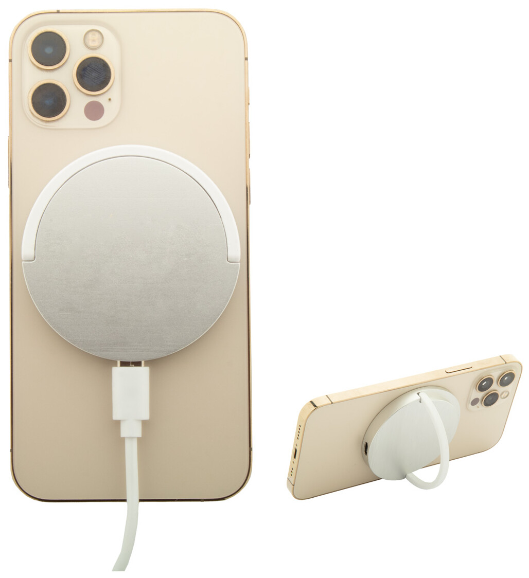 Magnetická bezdrátová rychlonabíječka (15W) s kroužkem držáku na mobil z recyklovaného hliníku a pouzdrem z recyklovaného ABS plastu. Kompatibilní s iPhone® 12 nebo novějším. Včetně USB-C nabíjecího kabelu.