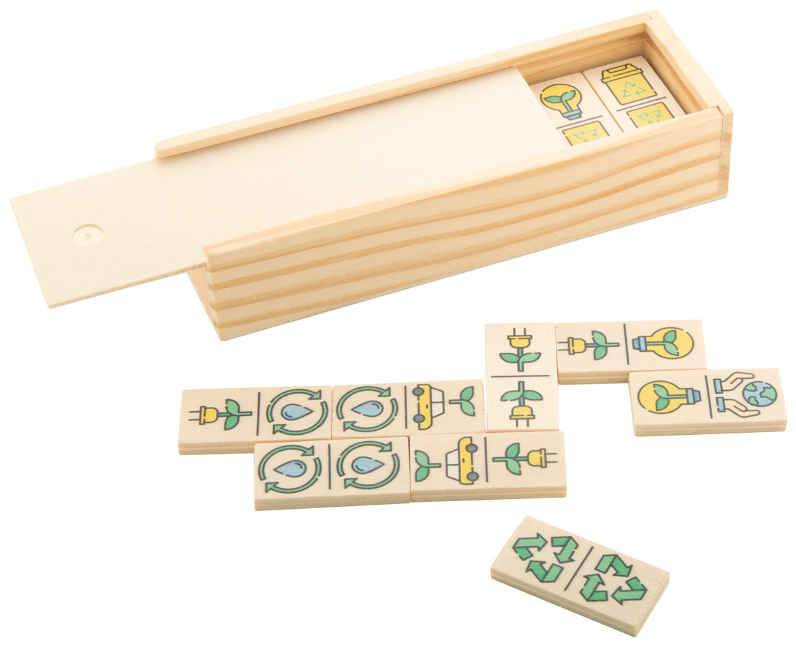 Dřevěné domino s tematickou grafikou, v dřevěné krabici. S 28 dílky.