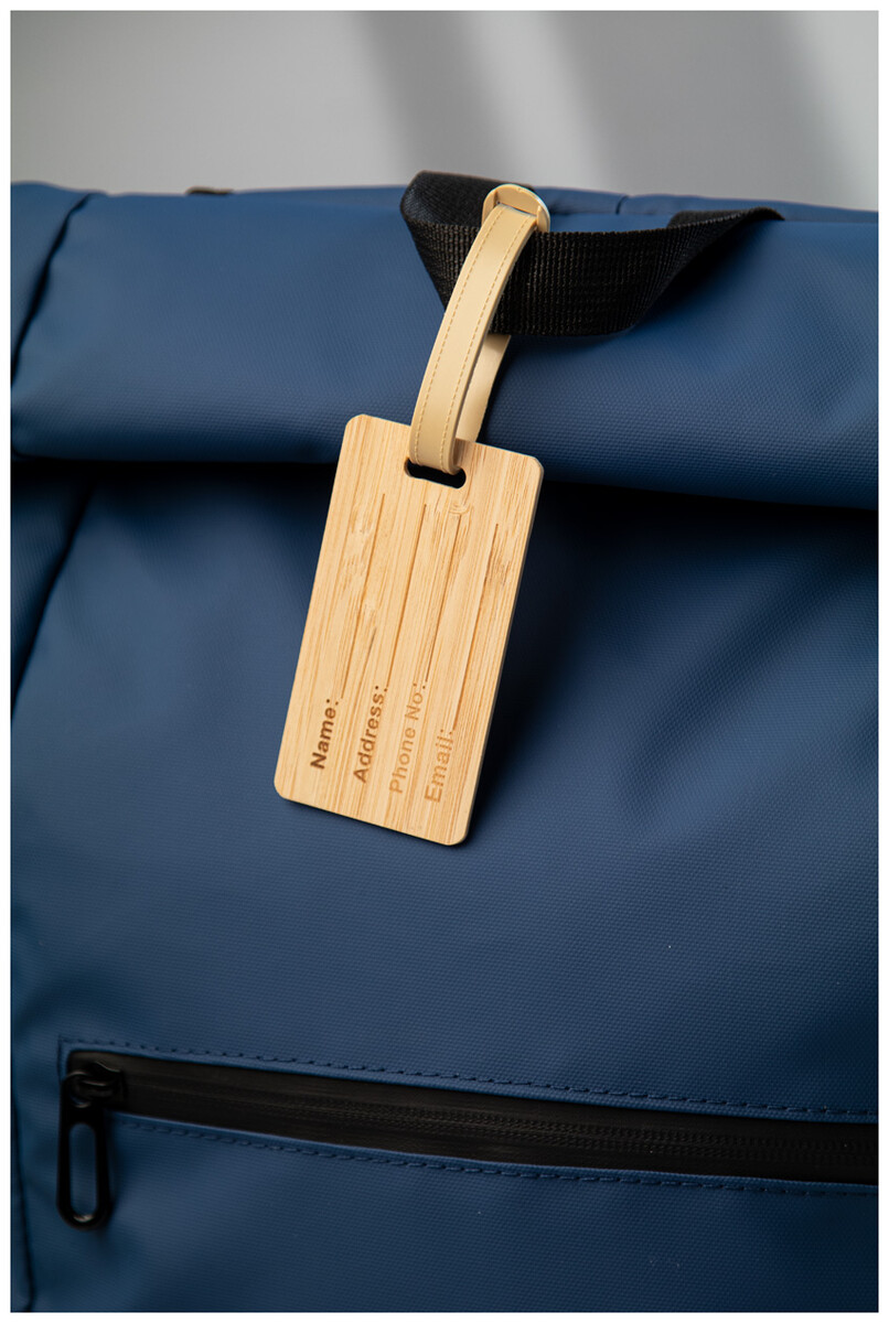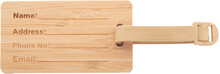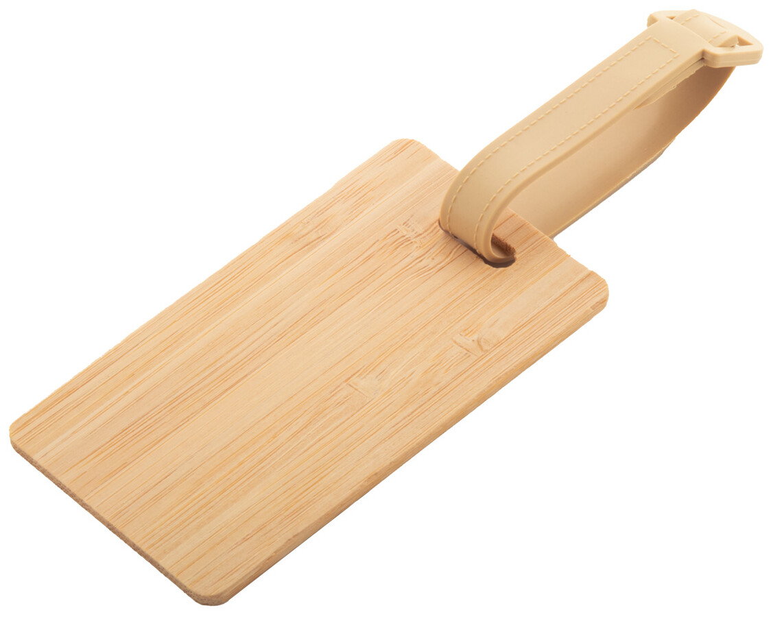 Bambusová visačka na zavazadla s plastovým páskem a přezkou.