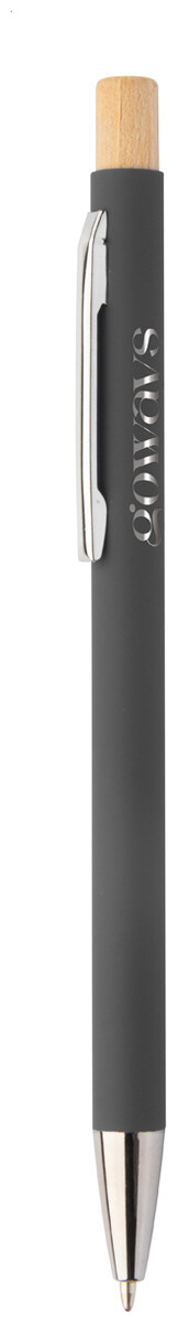 Kuličkové pero z recyklovaného hliníku s pogumovaným povrchem a bambusovým tlačítkem a chromovými detaily. Se speciální vrstvou pro zrcadlové laserové gravírování. S modrou náplní.