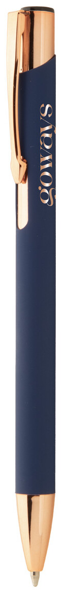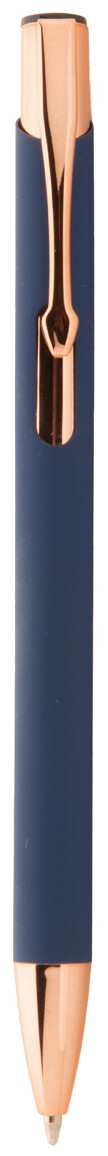 Kuličkové pero z recyklovaného hliníku s pogumovaným povrchem a detaily v barvě růžového zlata. Se speciální povrchovou úpravou pro zrcadlové laserové gravírování v barvě růžového zlata. S modrou náplní.